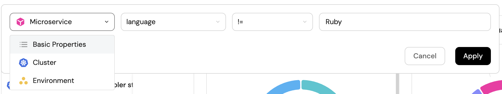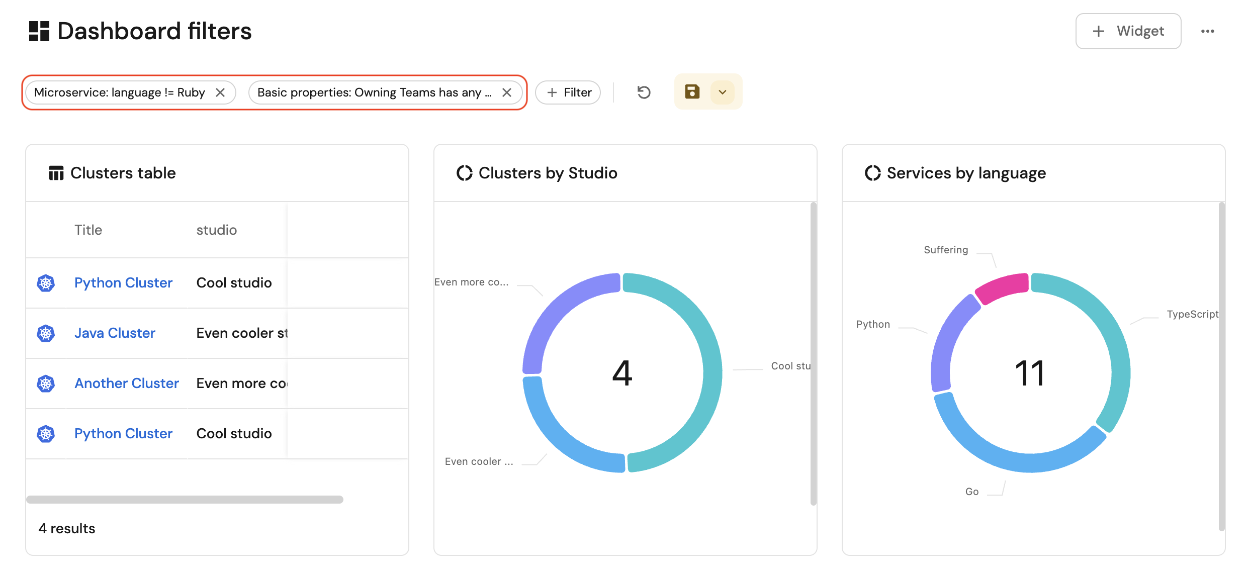 microserviceblueprint that excludes entities wherelanguage = Ruby. This filter only affects widgets that displaymicroservicedata. - A Basic properties filter on Owning teams, which applies to all supported widgets in the dashboard, regardless of blueprint.