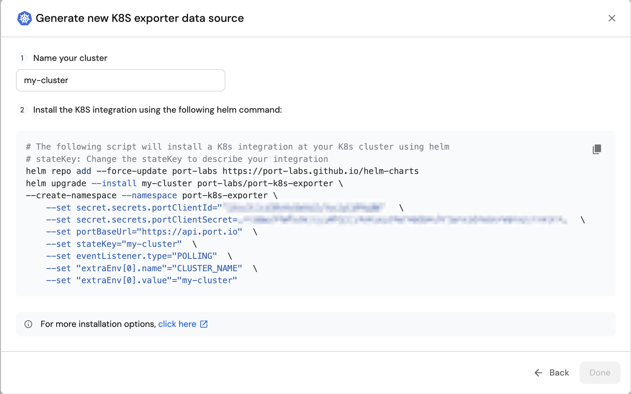 A helmcommand will be displayed, with default values already filled out (e.g. your Port client ID, client secret). Copy the command then run it in your terminal to install the integration.