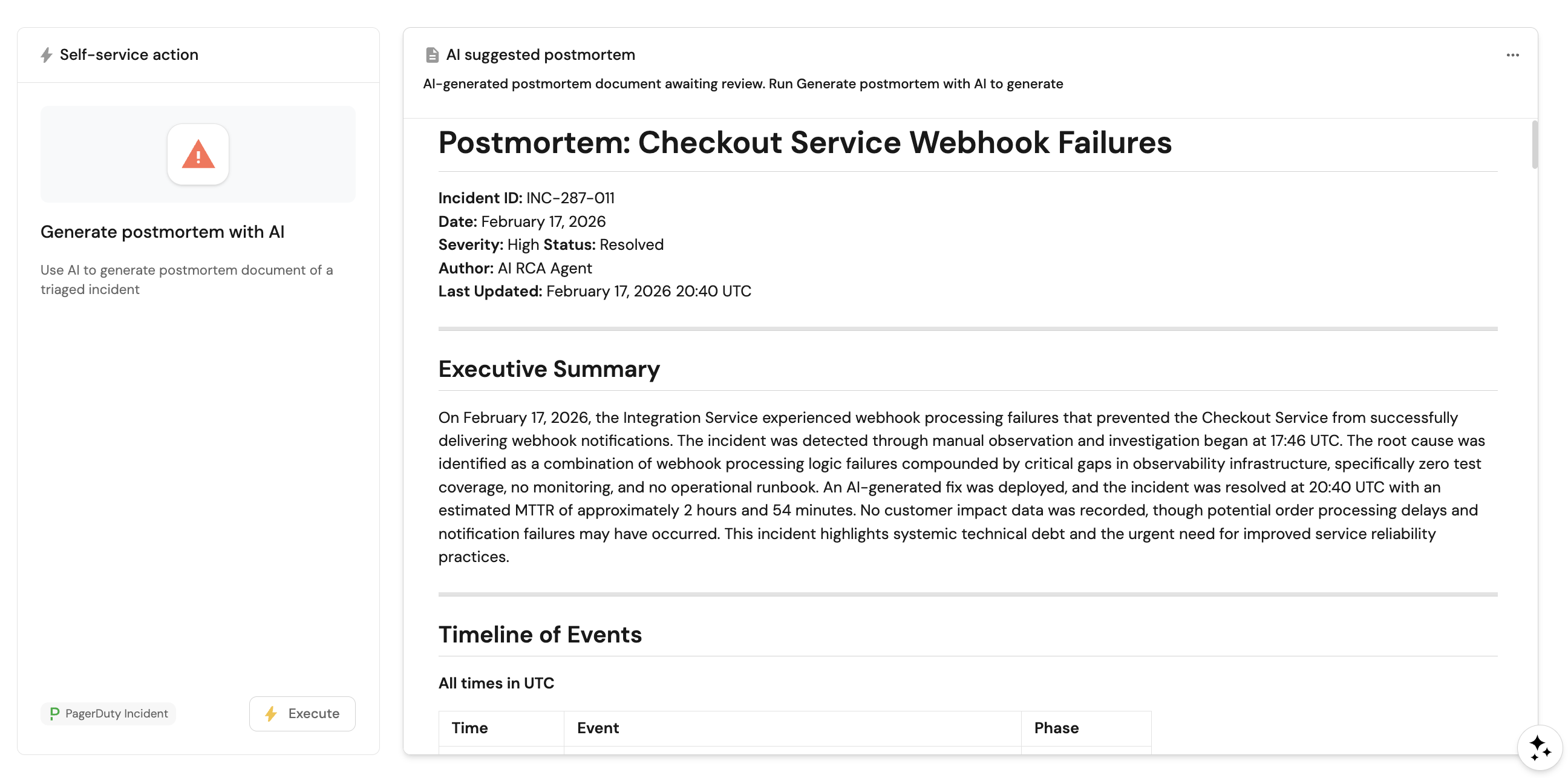 After resolving production incidents, teams need to generate comprehensive RCA (Root Cause Analysis) and postmortem documents that capture timeline, impact, root cause, action items, and lessons learned. This process is typically manual, time-consuming, and often inconsistent in quality or completeness. Teams either skip RCAs due to time pressure or produce low-quality retrospectives that don't prevent future incidents.