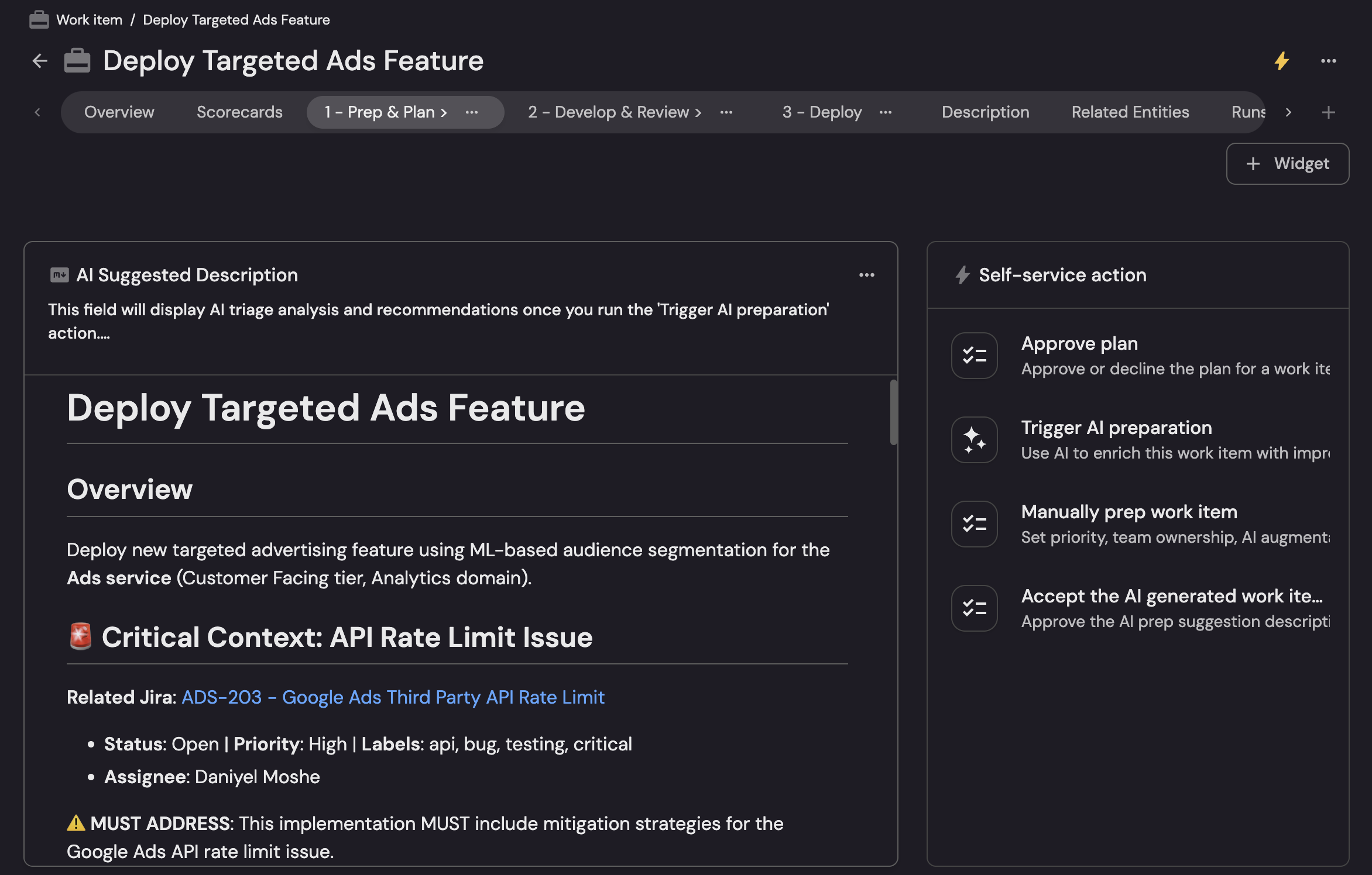 Work items often arrive with minimal context, which slows down planning and creates inconsistent handoffs. If you are an engineering manager, product manager, or tech lead preparing work for development, AI-powered prep helps you enrich descriptions, suggest owners and priorities, and meet scorecard requirements for faster sprint planning.