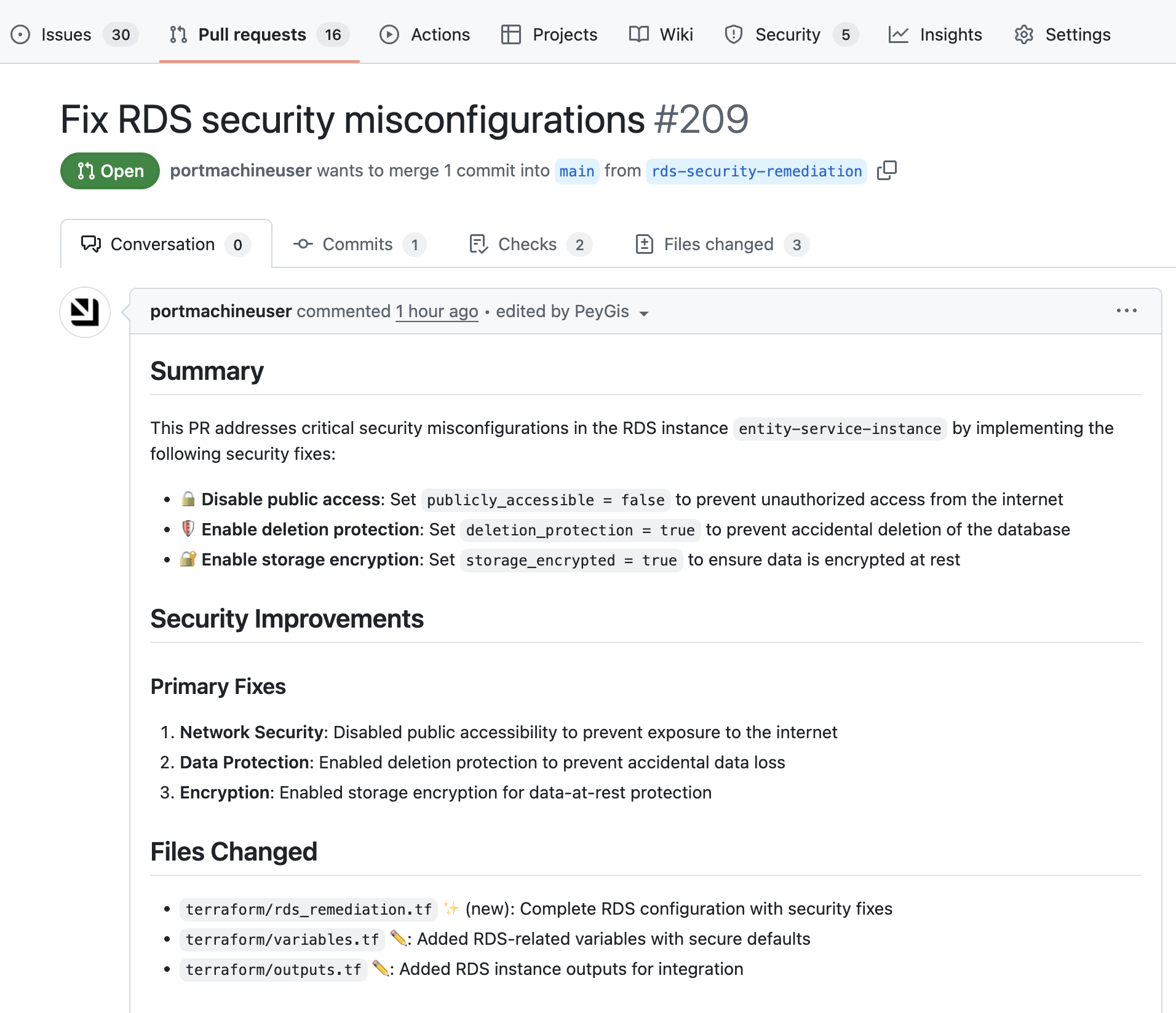 "prompt": "Here is the current configuration of the RDS instance: {{ .event.diff.after }}.\n\nGenerate a Terraform patch that remediates the following misconfigurations:\n1. Ensure the RDS instance is not publicly accessible (set publicly_accessible = false).\n2. Enable deletion protection (set deletion_protection = true).\n3. Ensure storage is encrypted (set storage_encrypted = true).\n\nThe Terraform must:\n- Be compatible with the existing AWS provider configuration.\n- Preserve existing identifiers (db_instance_identifier).\n- Only update the relevant security fields.\n- If an existing RDS file (e.g., rds.tf or main.tf) exists, append the fix there\n- If no such file exists, create a new file named rds_remediation.tf\nDo not overwrite unrelated files.\n\nAfter generating the code, open a PR with a description summarizing what was fixed and why."