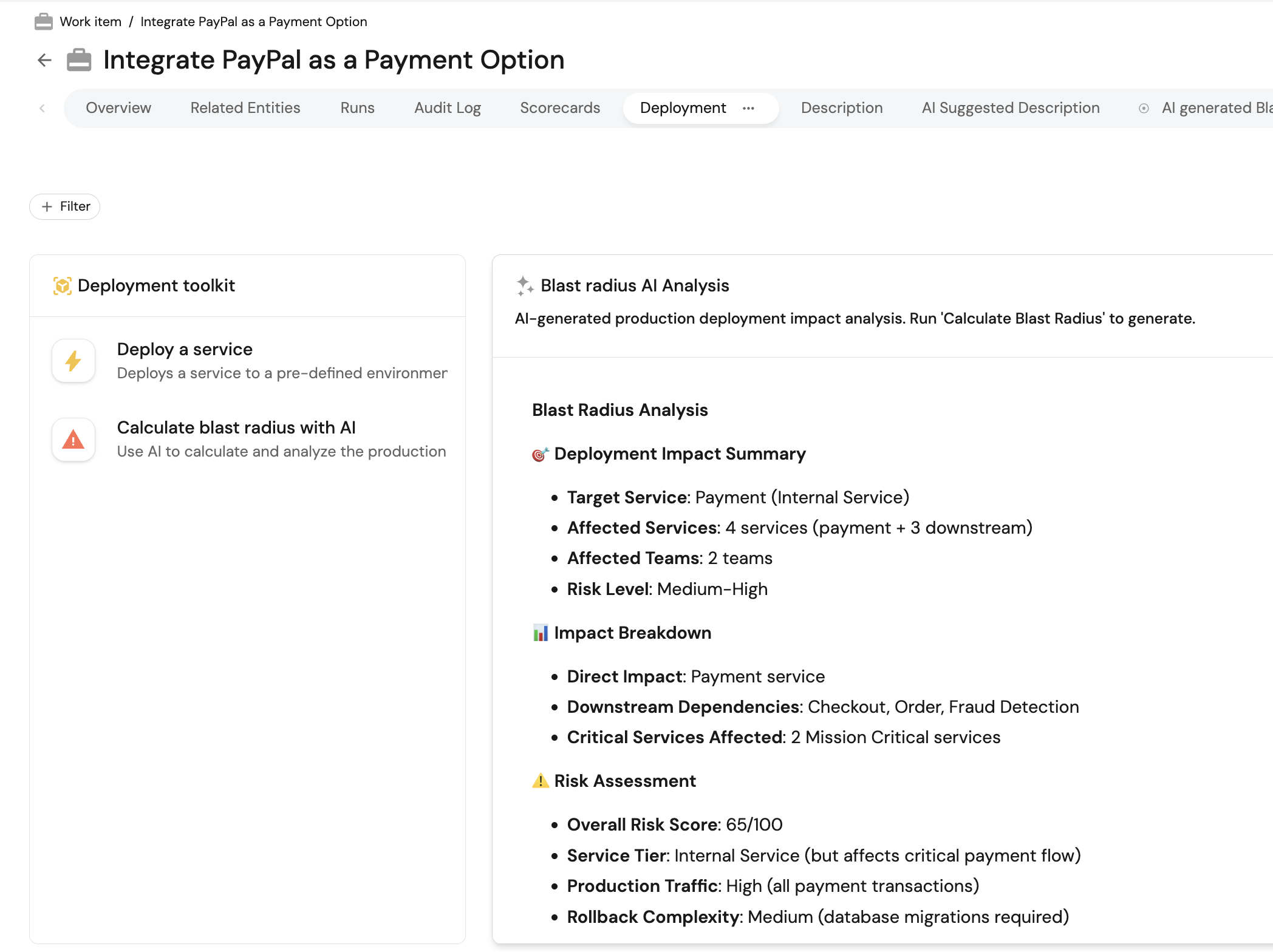 - Description: AI-generated production deployment impact analysis. Run Calculate blast radius with AI to generate.