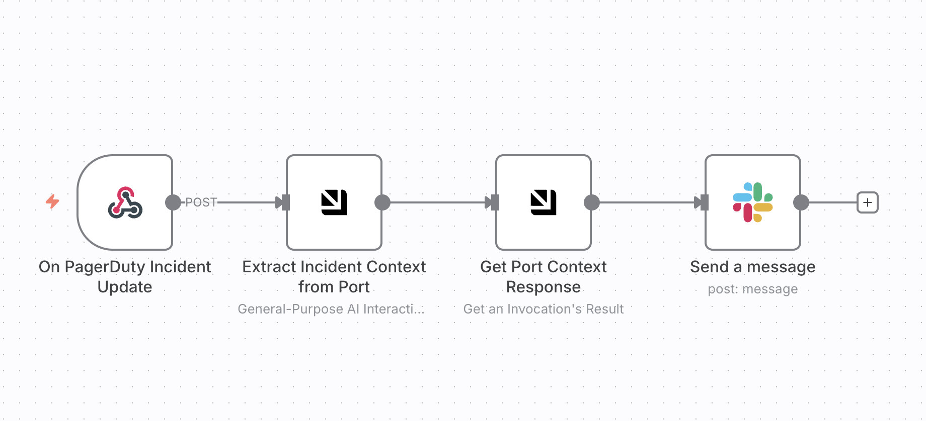 Verify Port context retrieval ā Check that the "Extract Incident Context from Port" and "Get Port Context Response" nodes successfully retrieve: