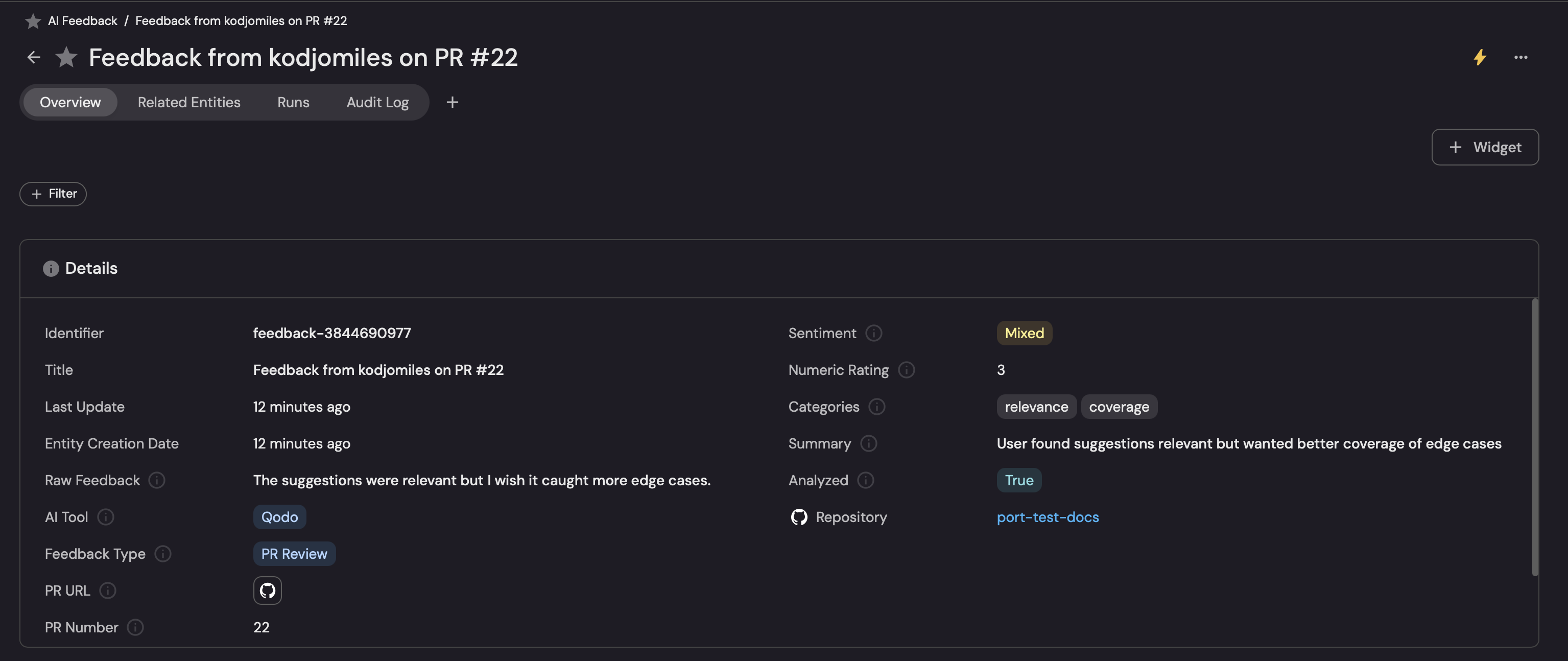 "description": "AI agent that analyzes developer feedback on AI tools and extracts structured insights, then updates the feedback entity with the results",