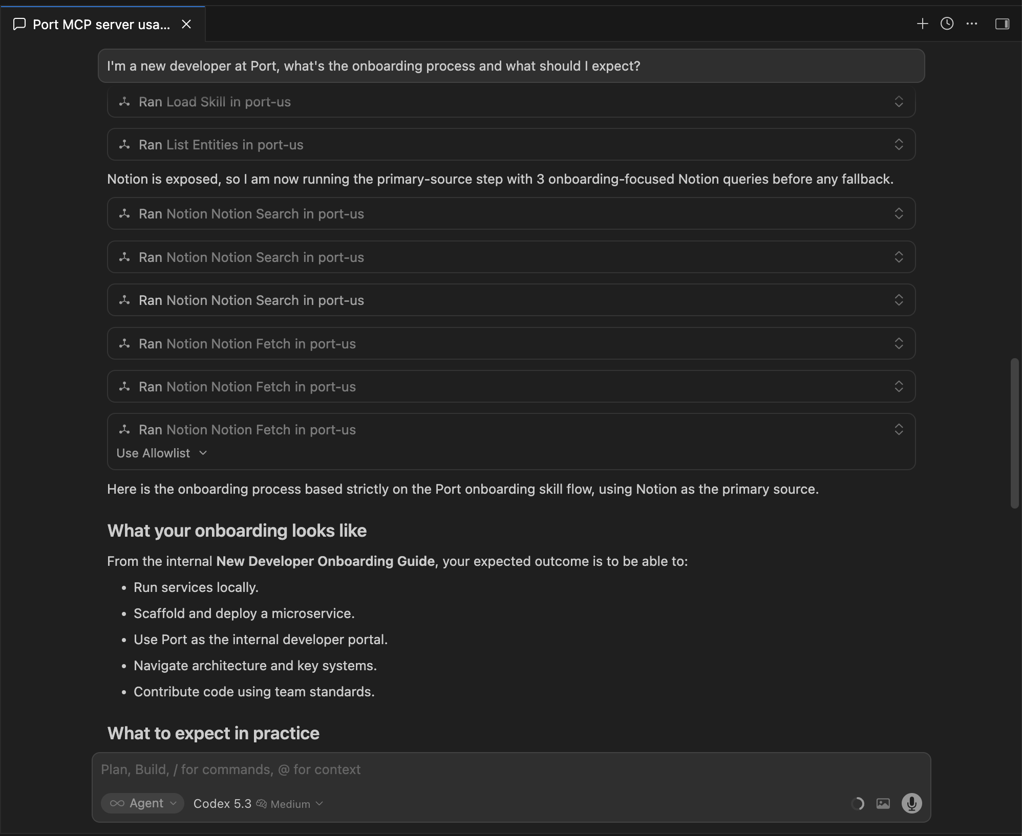 - Relevant onboarding content in your knowledge sources - Notion pages and Port Context Lake are both supported.