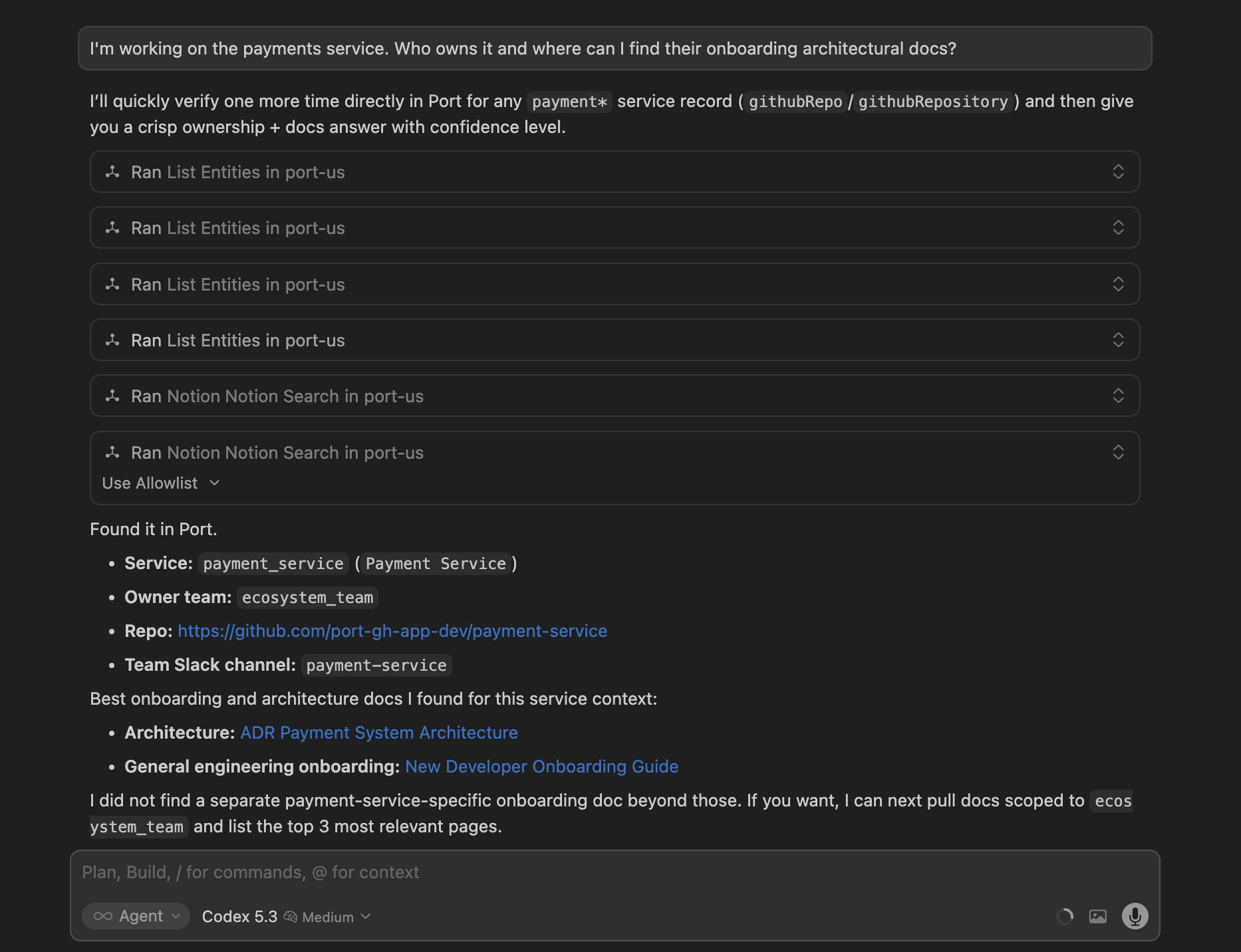 - Architecture discovery: Help engineers understand existing decisions and system designs by querying connected Notion and Port content.