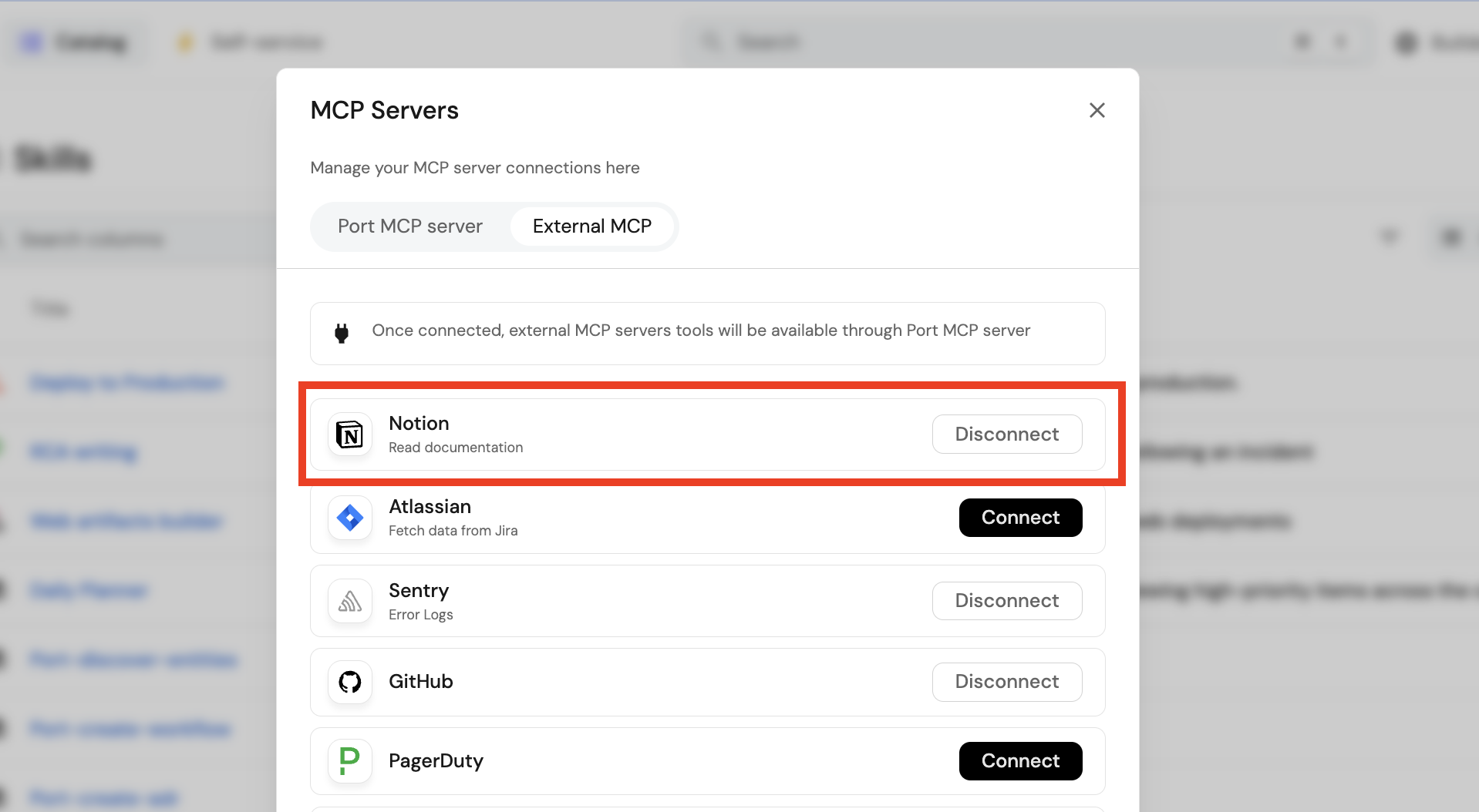 Connect to the Notion MCP server using Port MCP connector capabilities. You can learn more in MCP connectors.