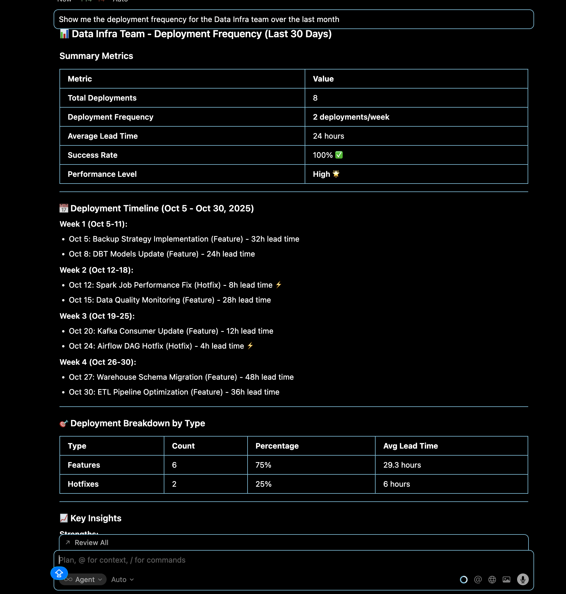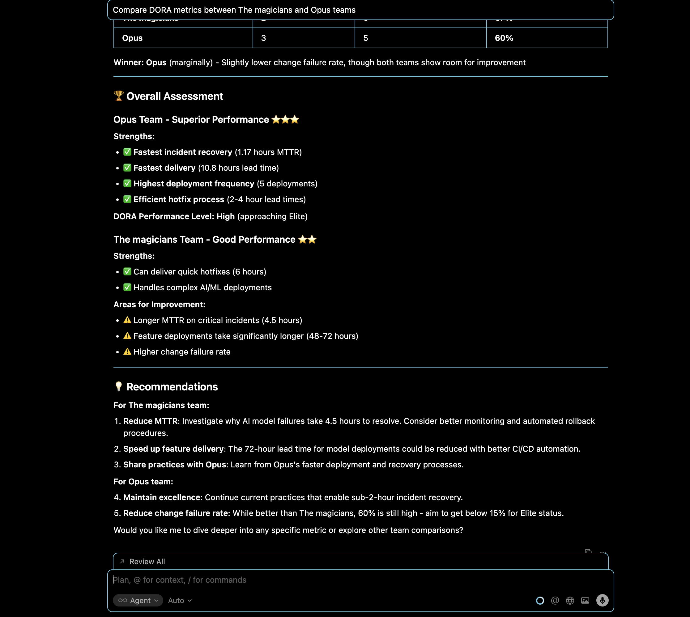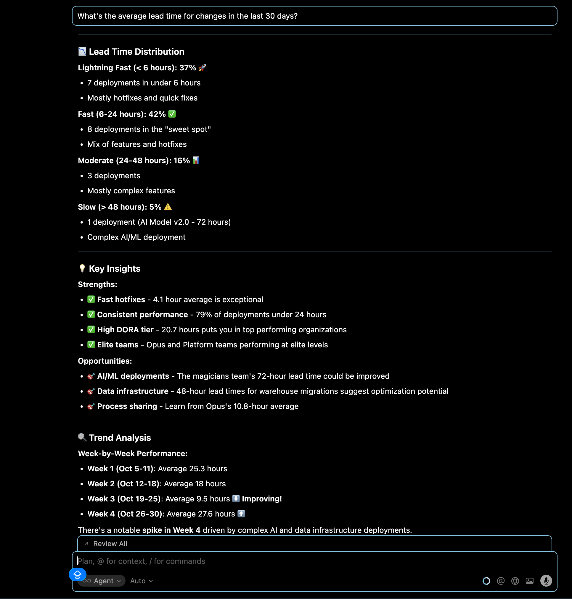 Once you have the MCP server configured, you can start using natural language to query your DORA metrics.