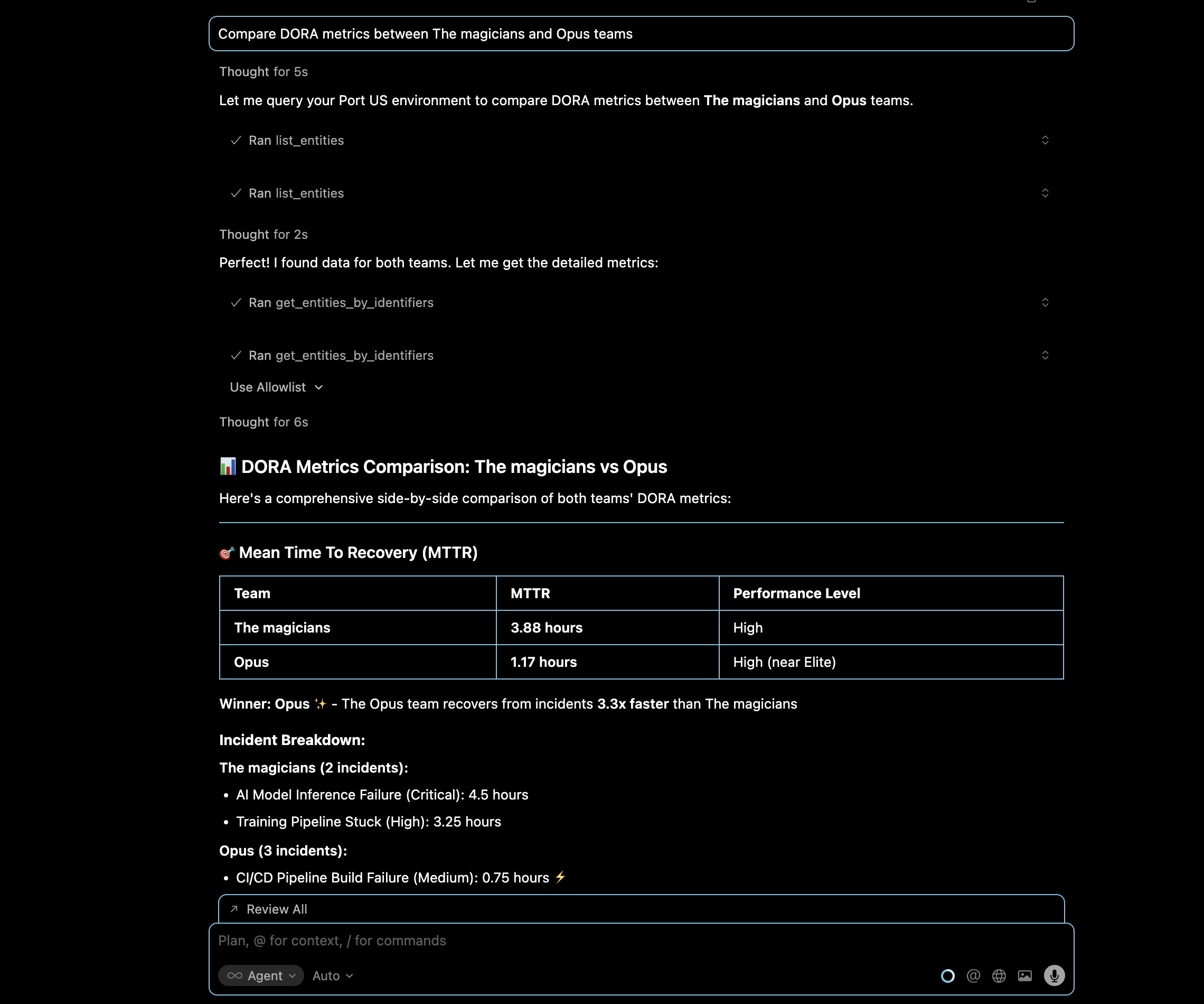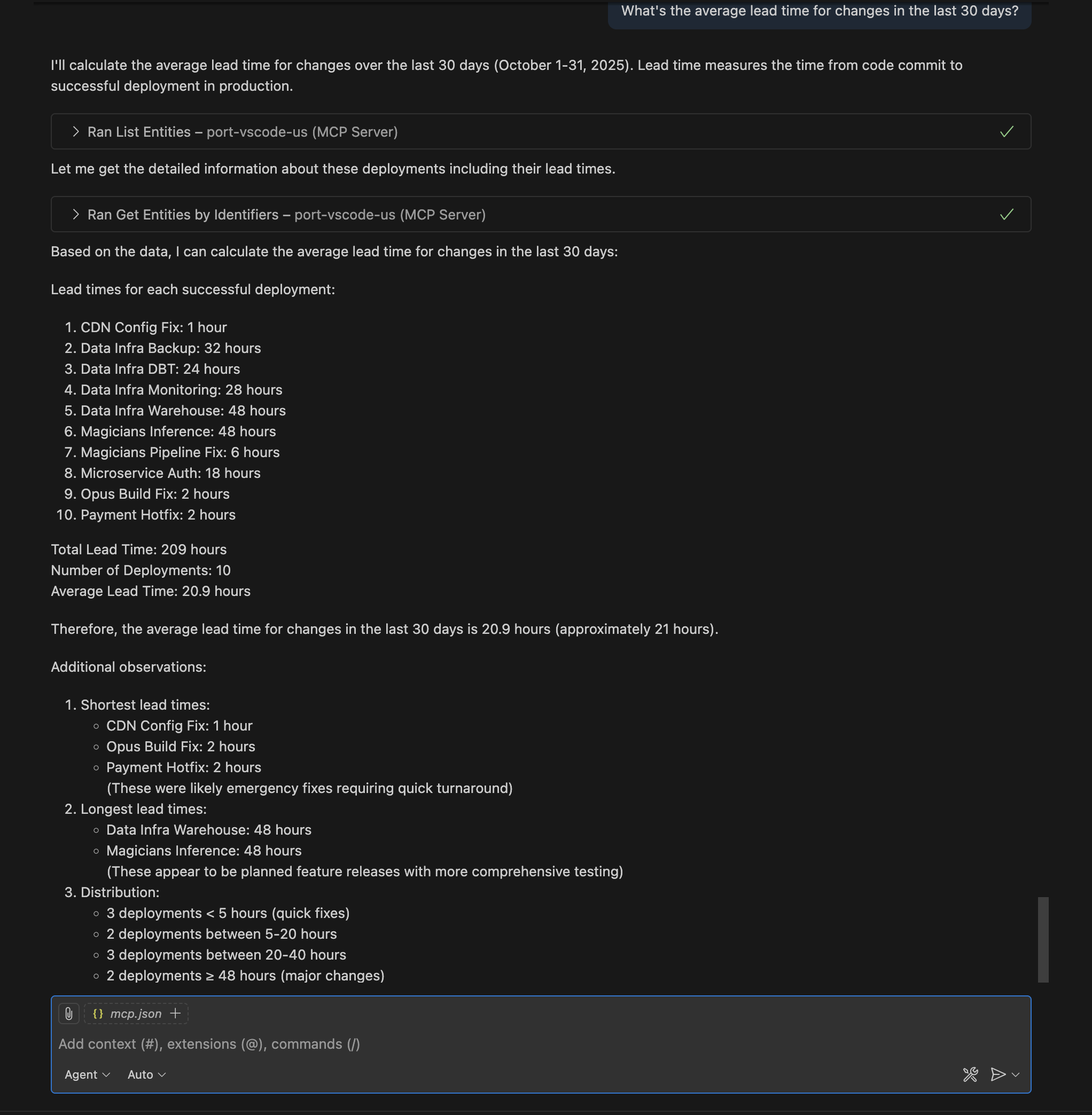 This guide demonstrates how to use Port's Model Context Protocol (MCP) server to query DORA metrics using natural language commands directly from your IDE or AI-powered tools. By leveraging the MCP server, you can access deployment frequency, lead time, change failure rate, and mean time to recovery data without leaving your development environment.