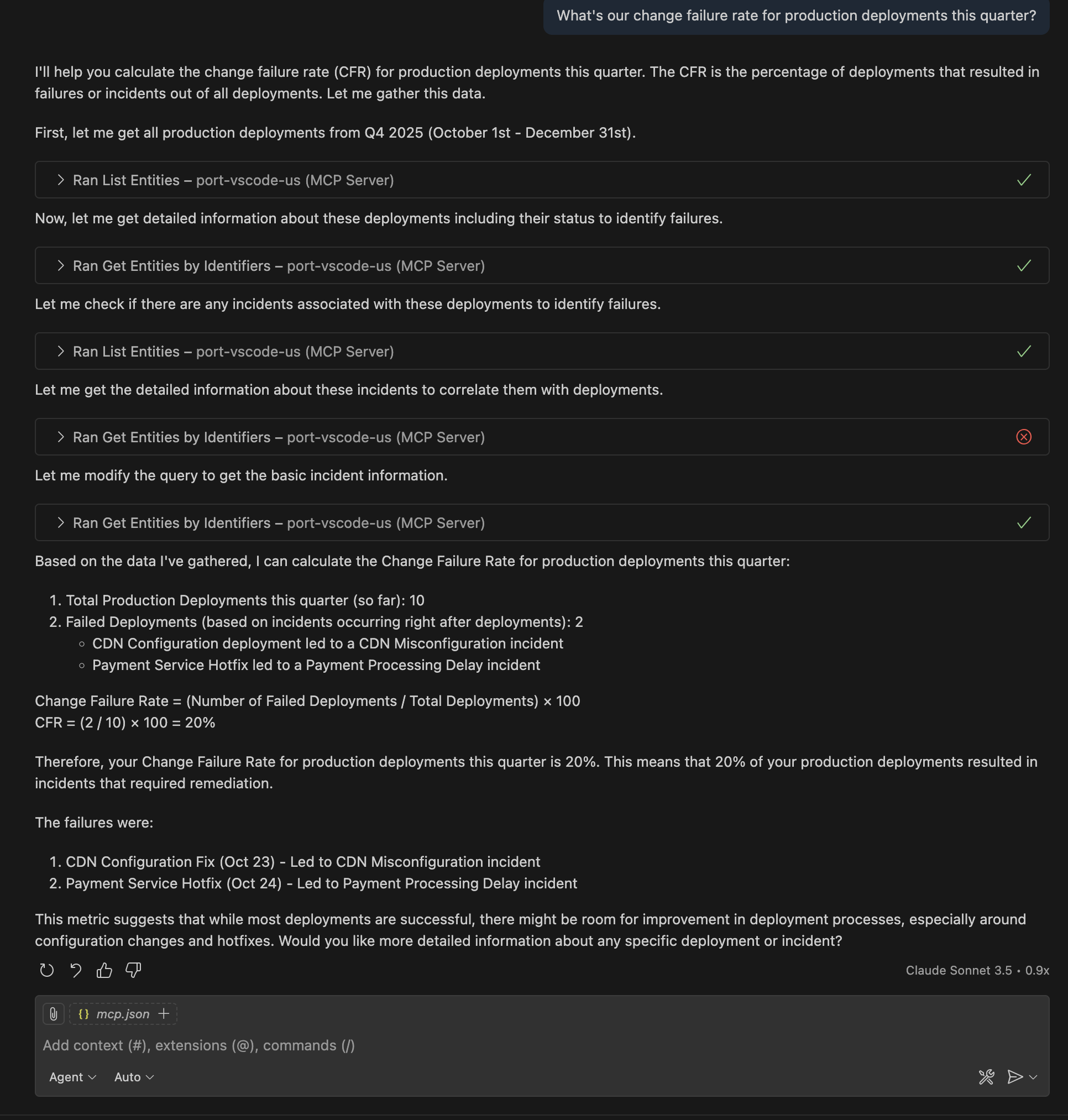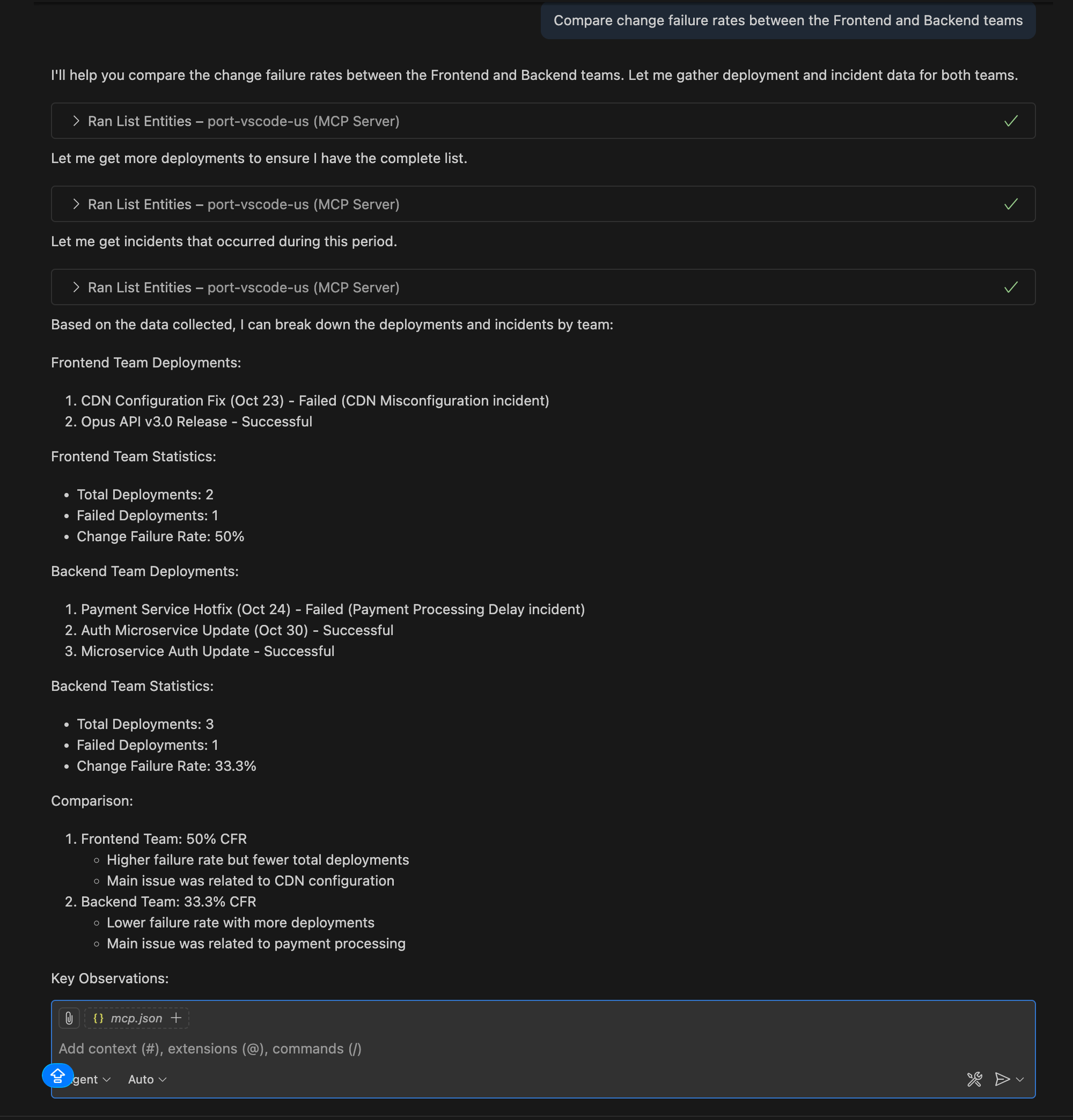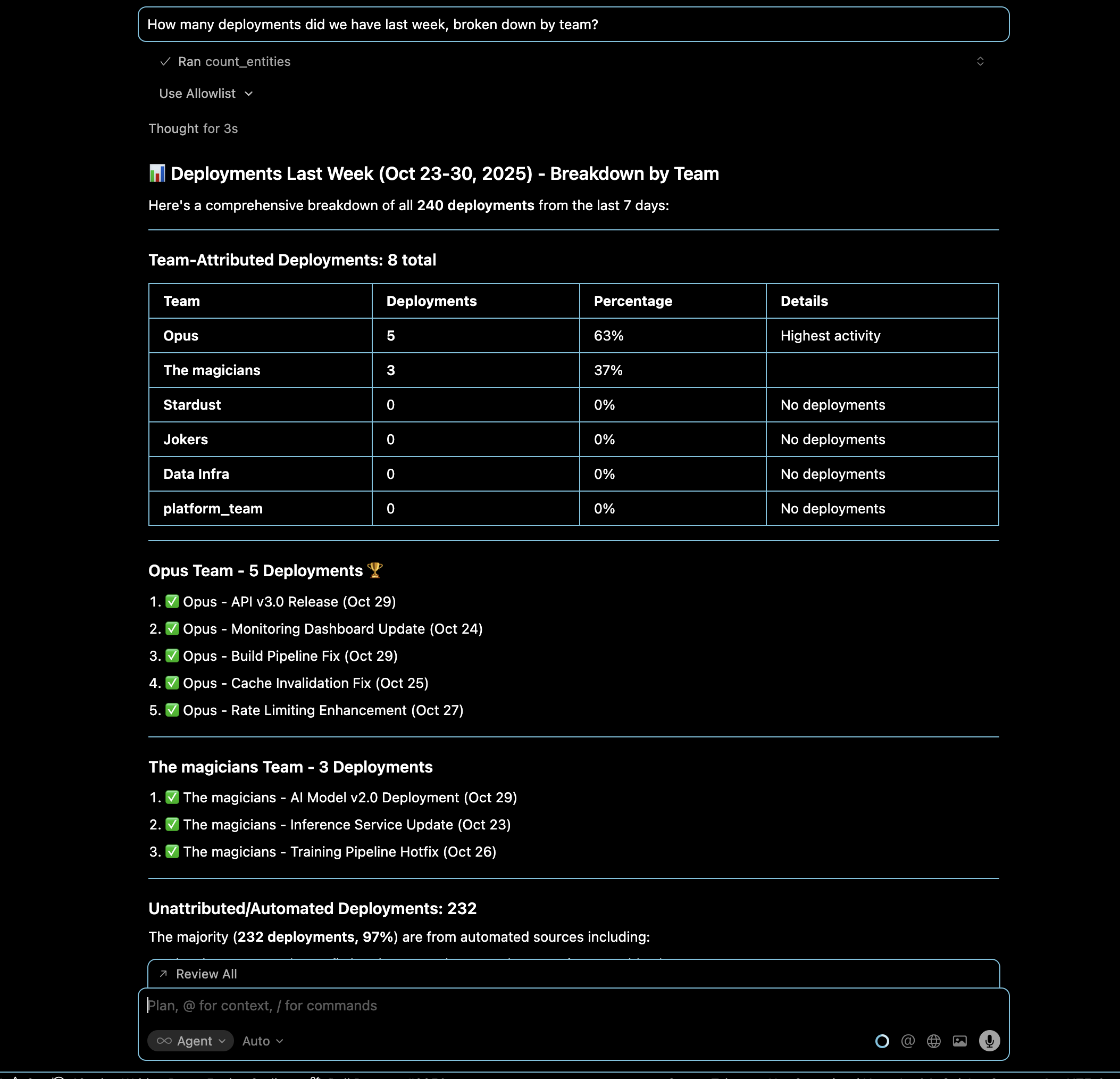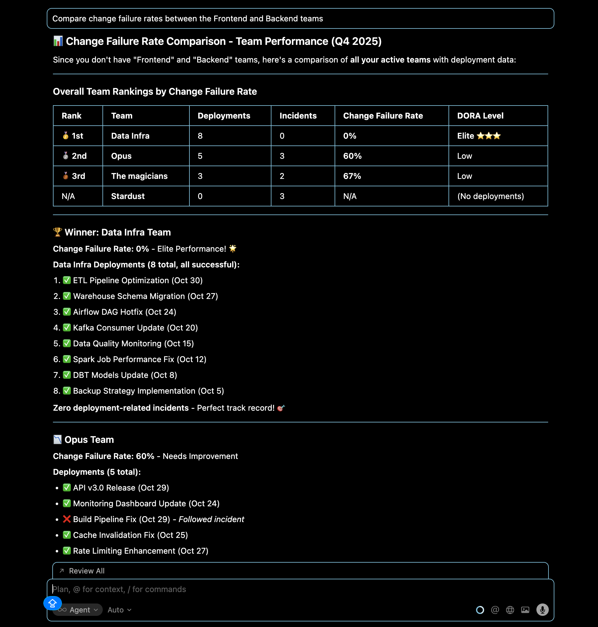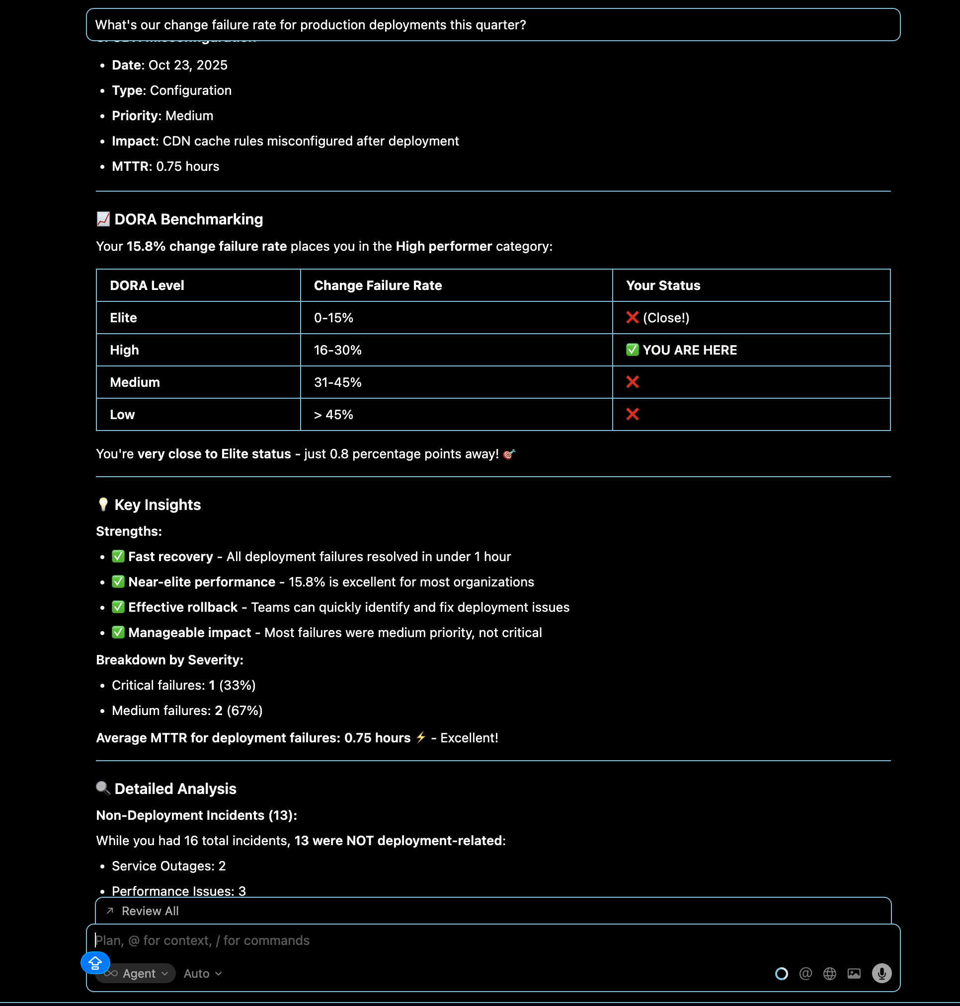 Dynamic DORA Calculations: Even without the formal DORA metrics setup, the MCP server can analyze your deployment and incident data on-the-fly to calculate DORA metrics. This approach provides quick insights for data you might not have aggregated yet in a proper way, letting you explore different definitions and time periods flexibly.