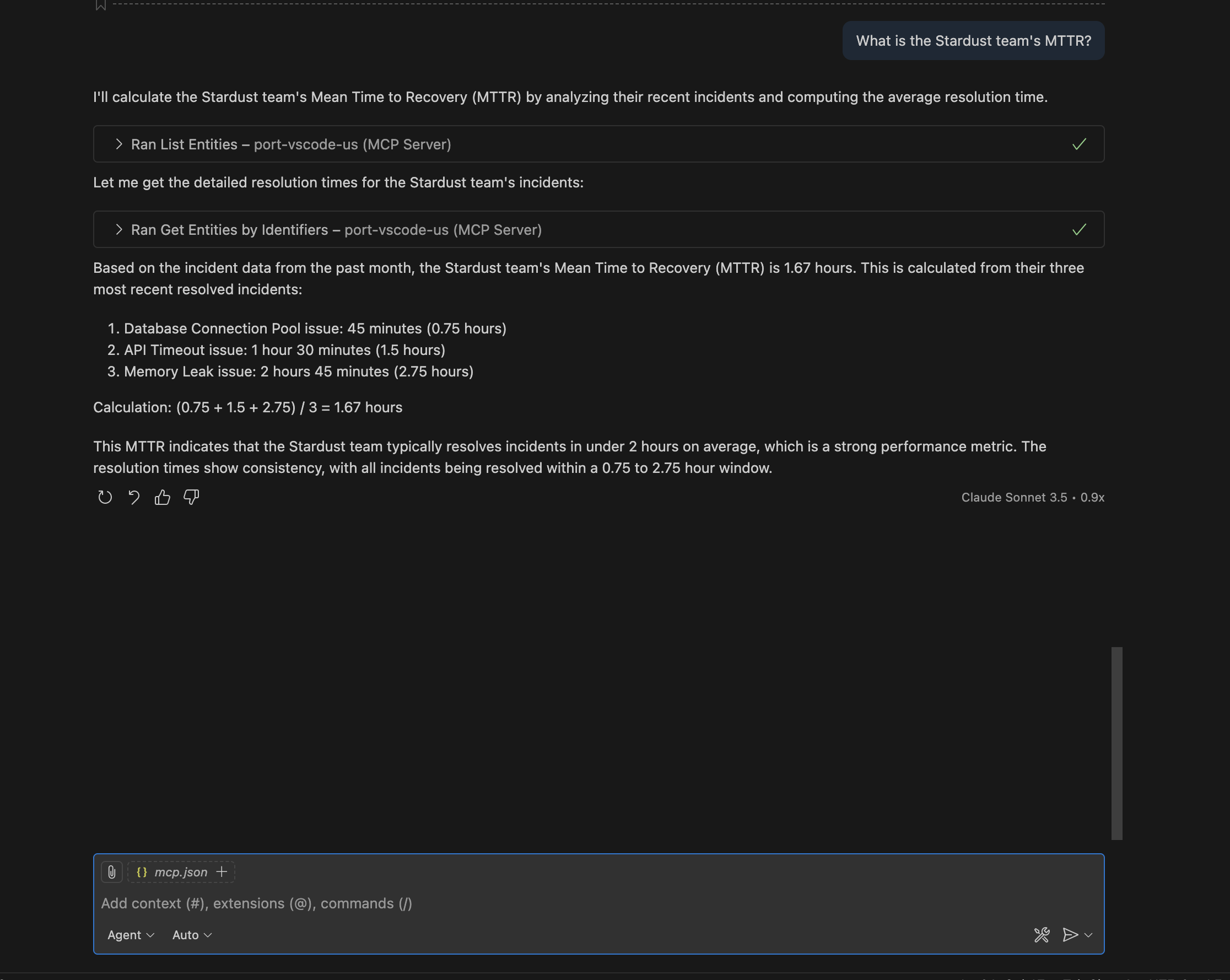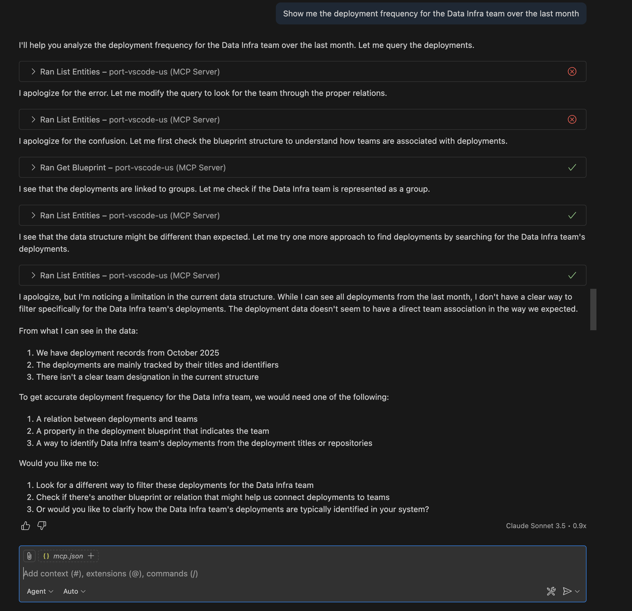 - Use the MCP server's ability to cross-reference with other Port data like scorecards and service health.