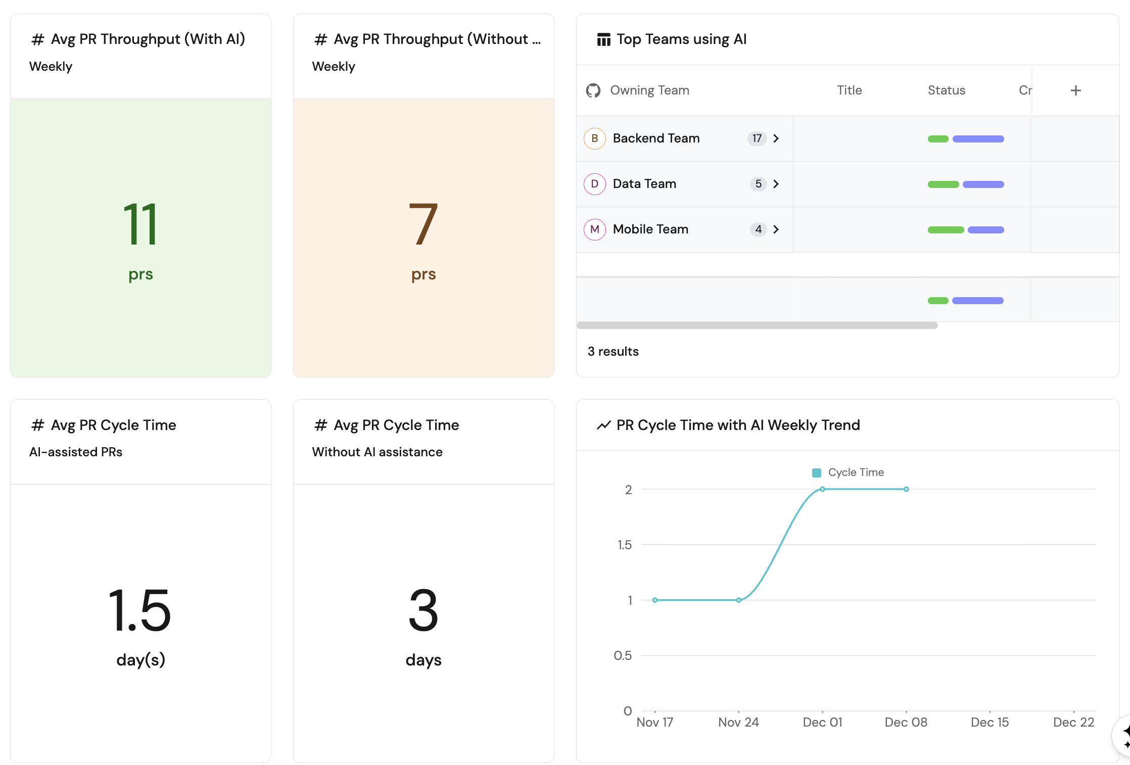- Compare PR throughput and cycle time between AI-assisted and traditional workflows.