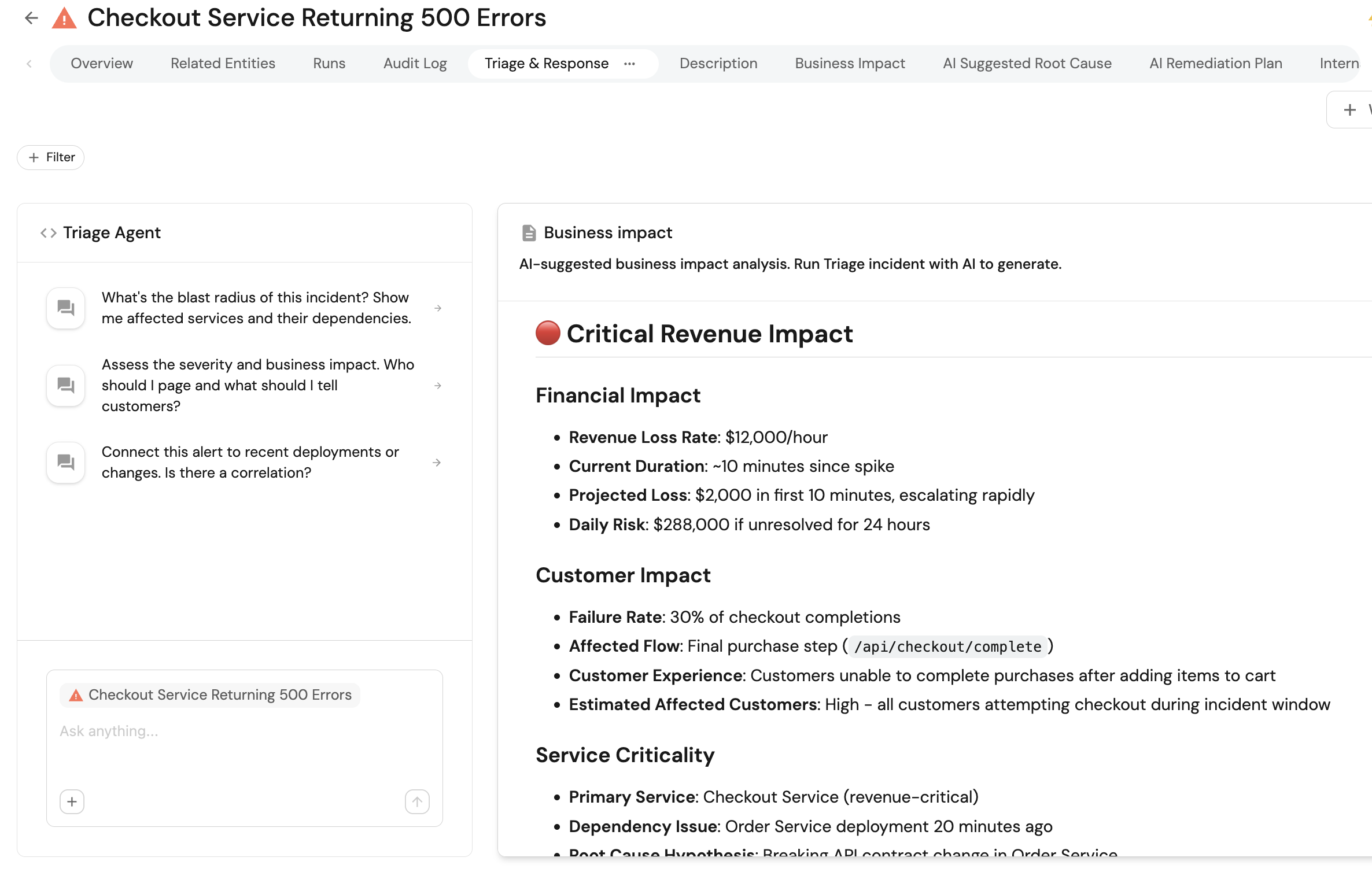 ai_suggested_severity,business_impact,internal_comms_message, and optionallystatus_page_message,ai_suggested_owner, andai_suggested_response_teamto the incident. -