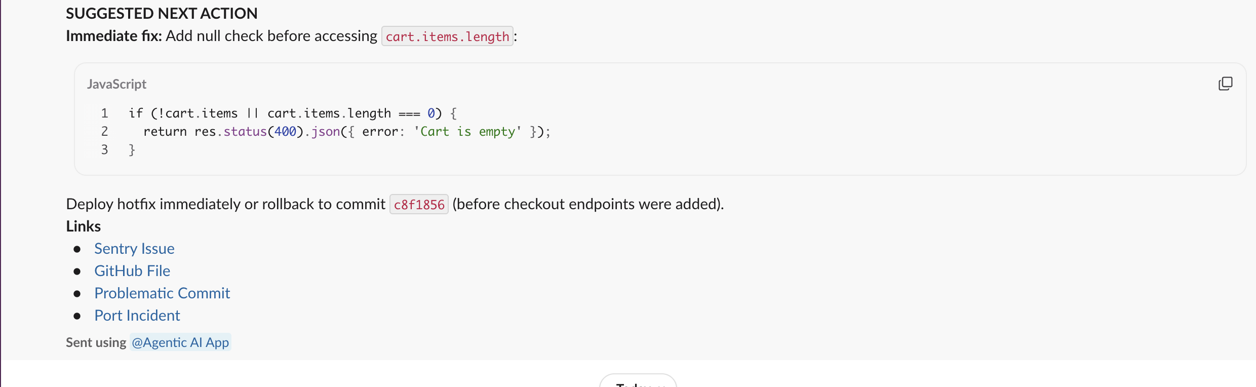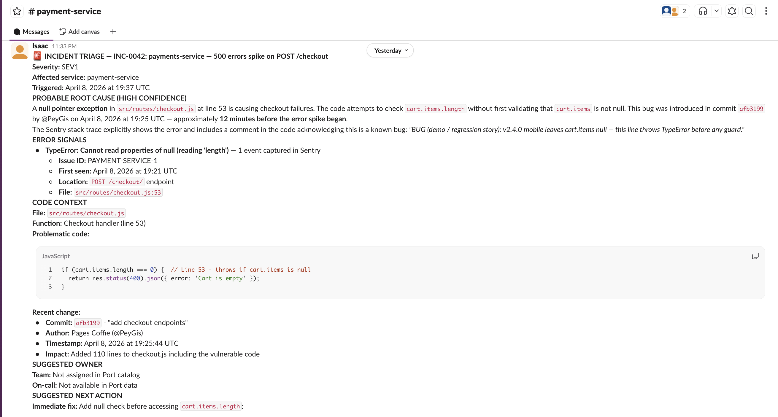 - First-response triage: Get a structured root-cause summary within minutes of an incident being created, before an engineer has had time to open Sentry.