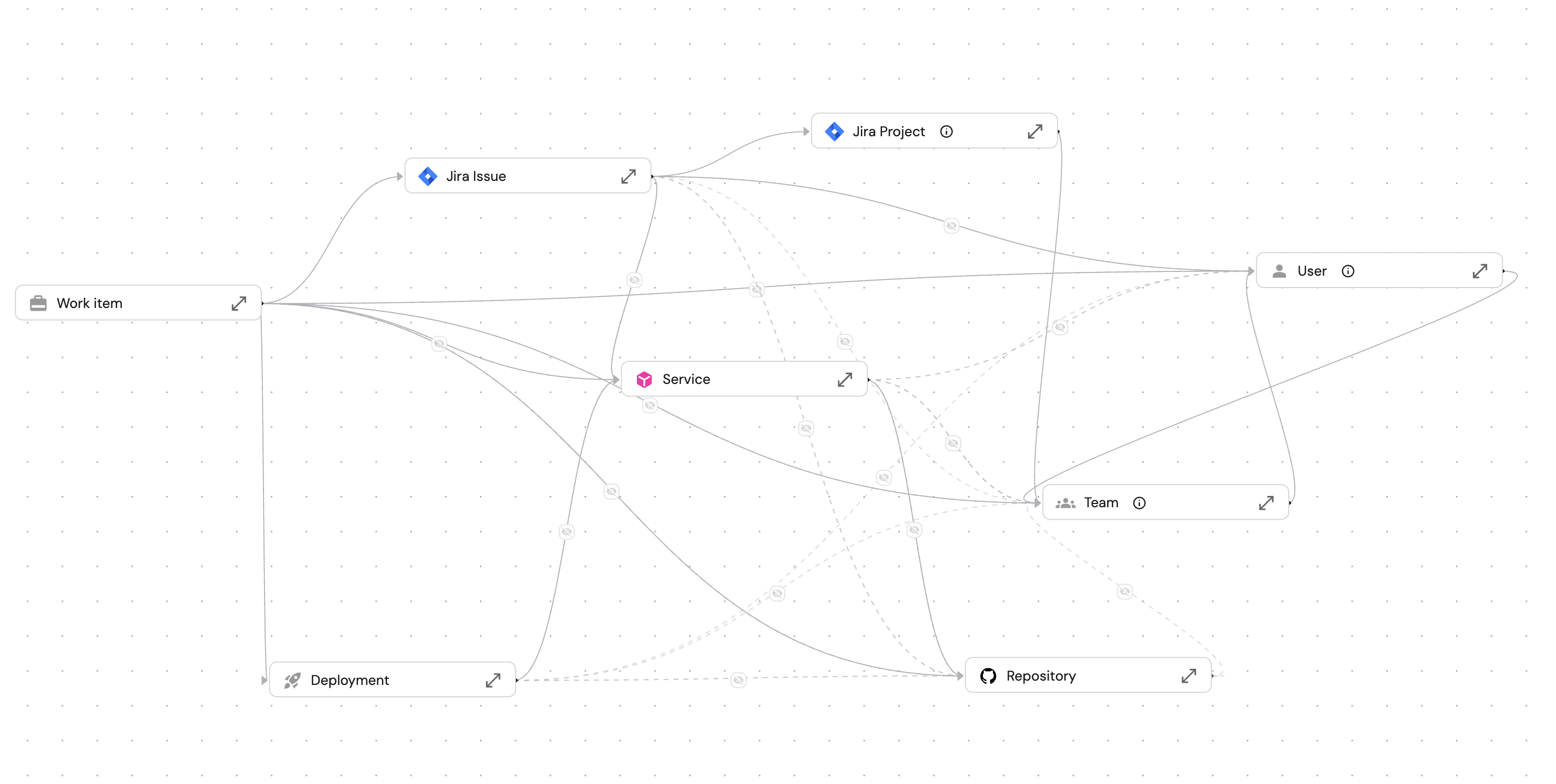 The image above shows how the work_item blueprint connects to entities across your software catalog like Jira issue, the service being modified, the team and owner responsible, the repository and PR where code changes happen, and the deployment record.