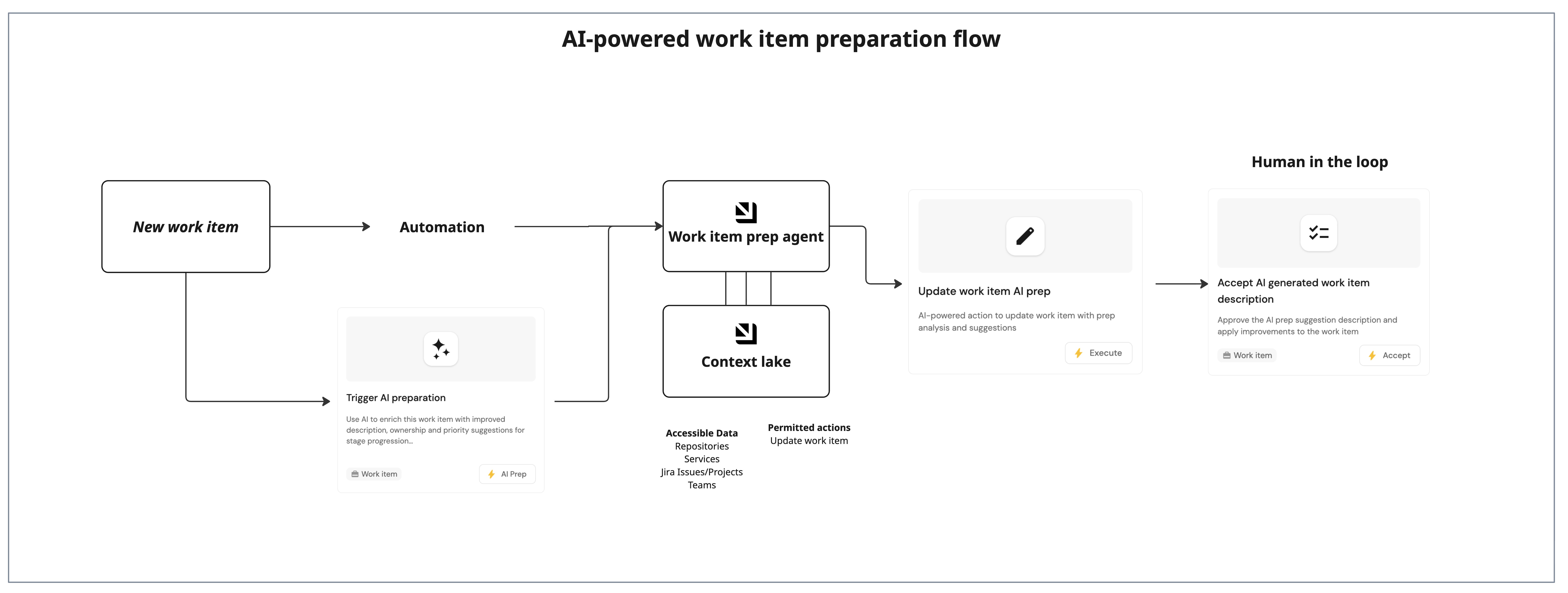 This guide demonstrates how to use Port's AI to prepare work items so you can add missing context, validate readiness, and streamline stage progression. You will update your data model, configure an AI agent, and trigger the prep flow from self-service actions with human in the loop support.