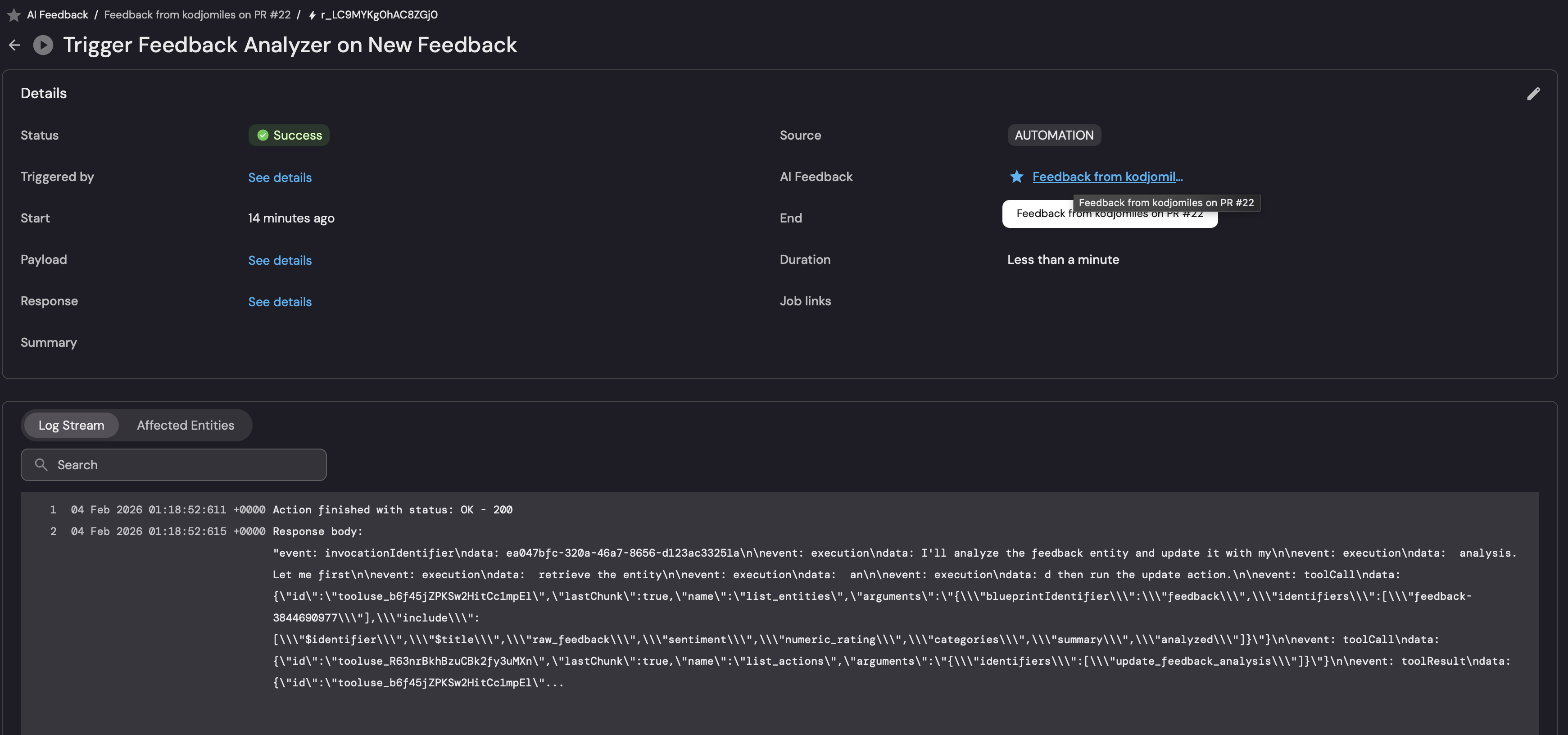 Check the AI Invocations page to see the feedback analyzer agent processing the feedback.