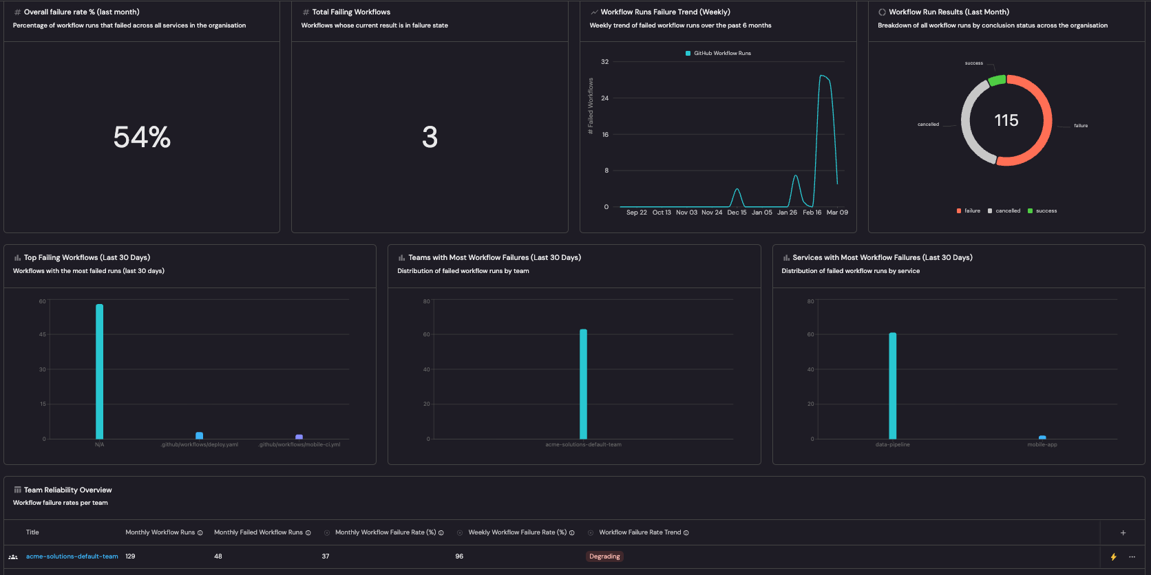 | Team failure distribution | Failed workflow runs broken down by team | Shows which teams carry the most reliability burden |