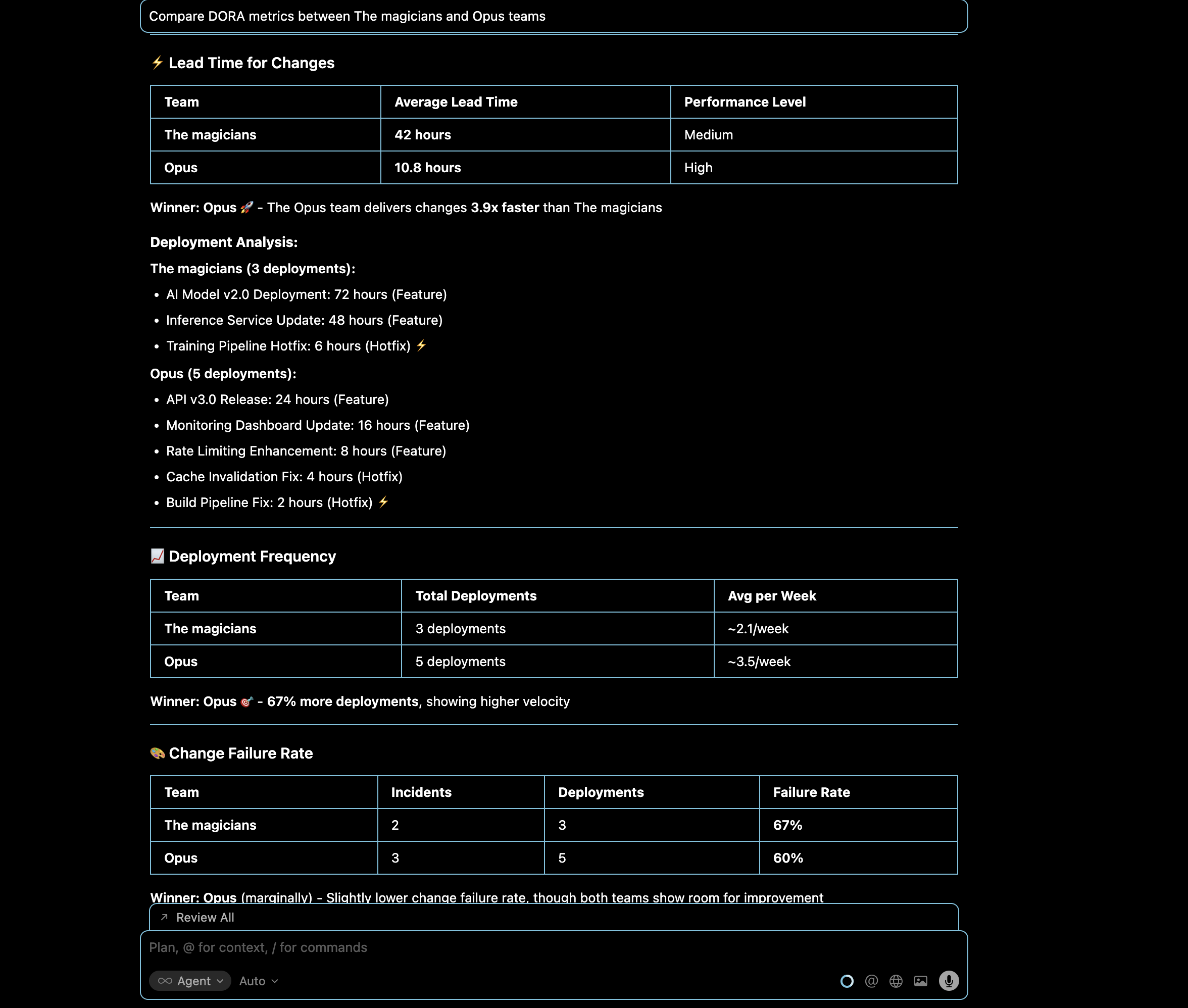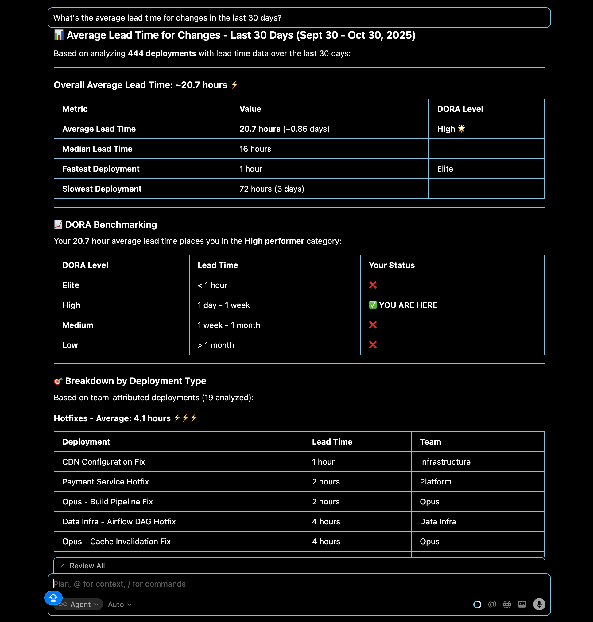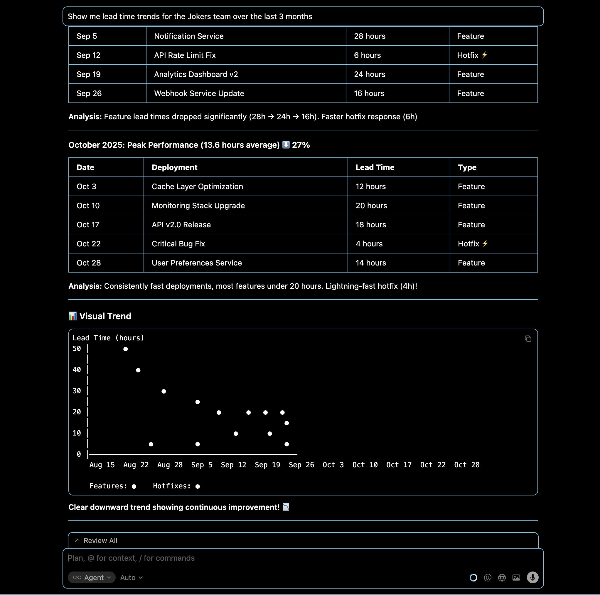 Once you have the MCP server configured, you can start using natural language to query your DORA metrics.