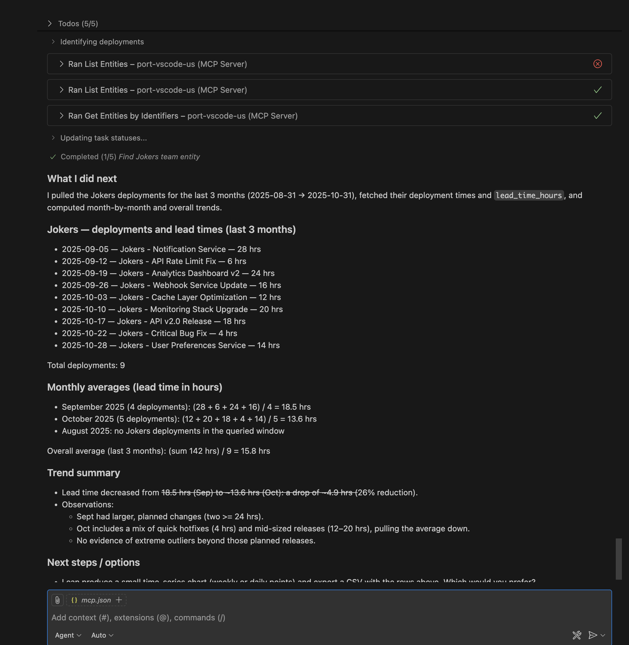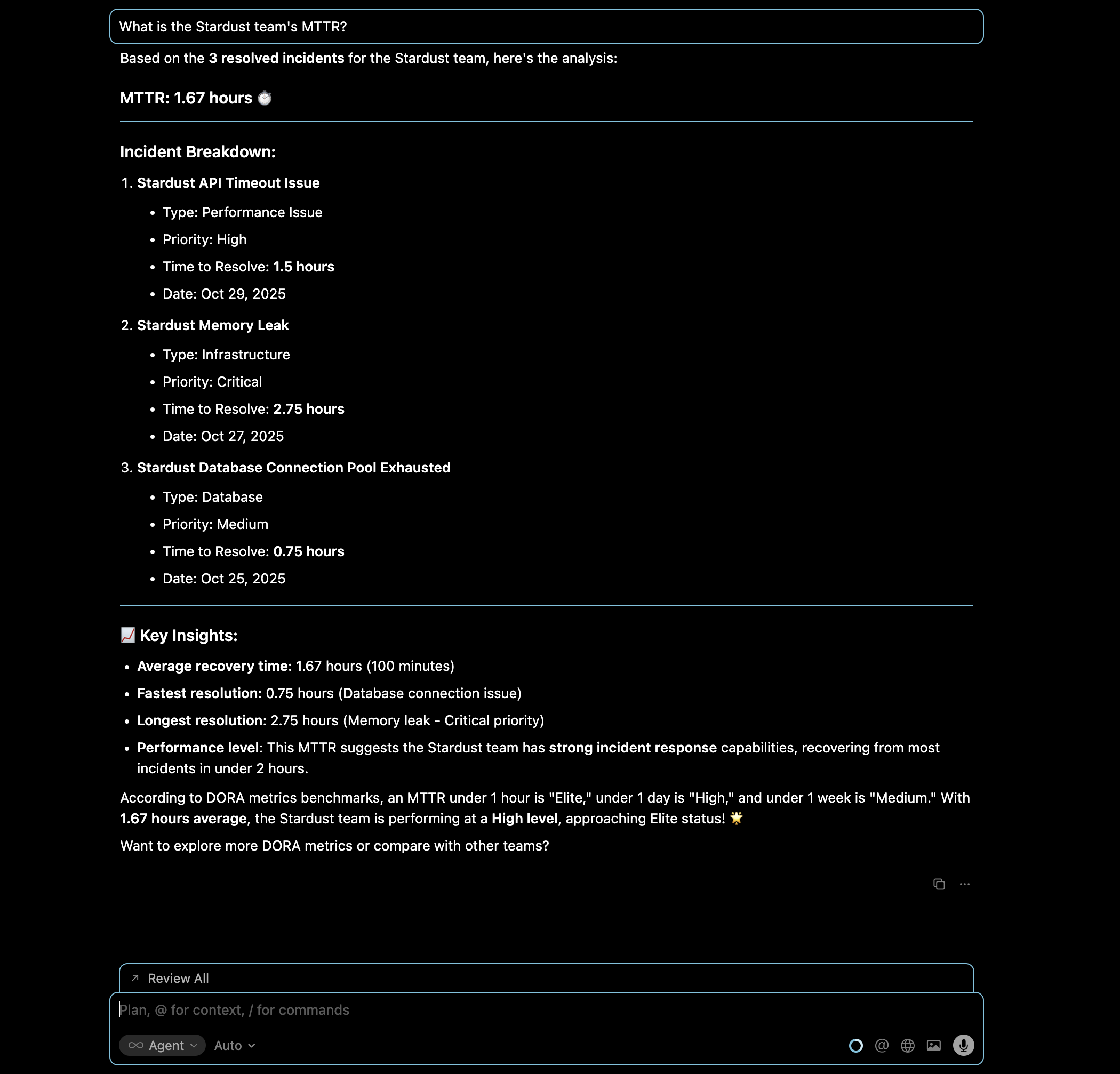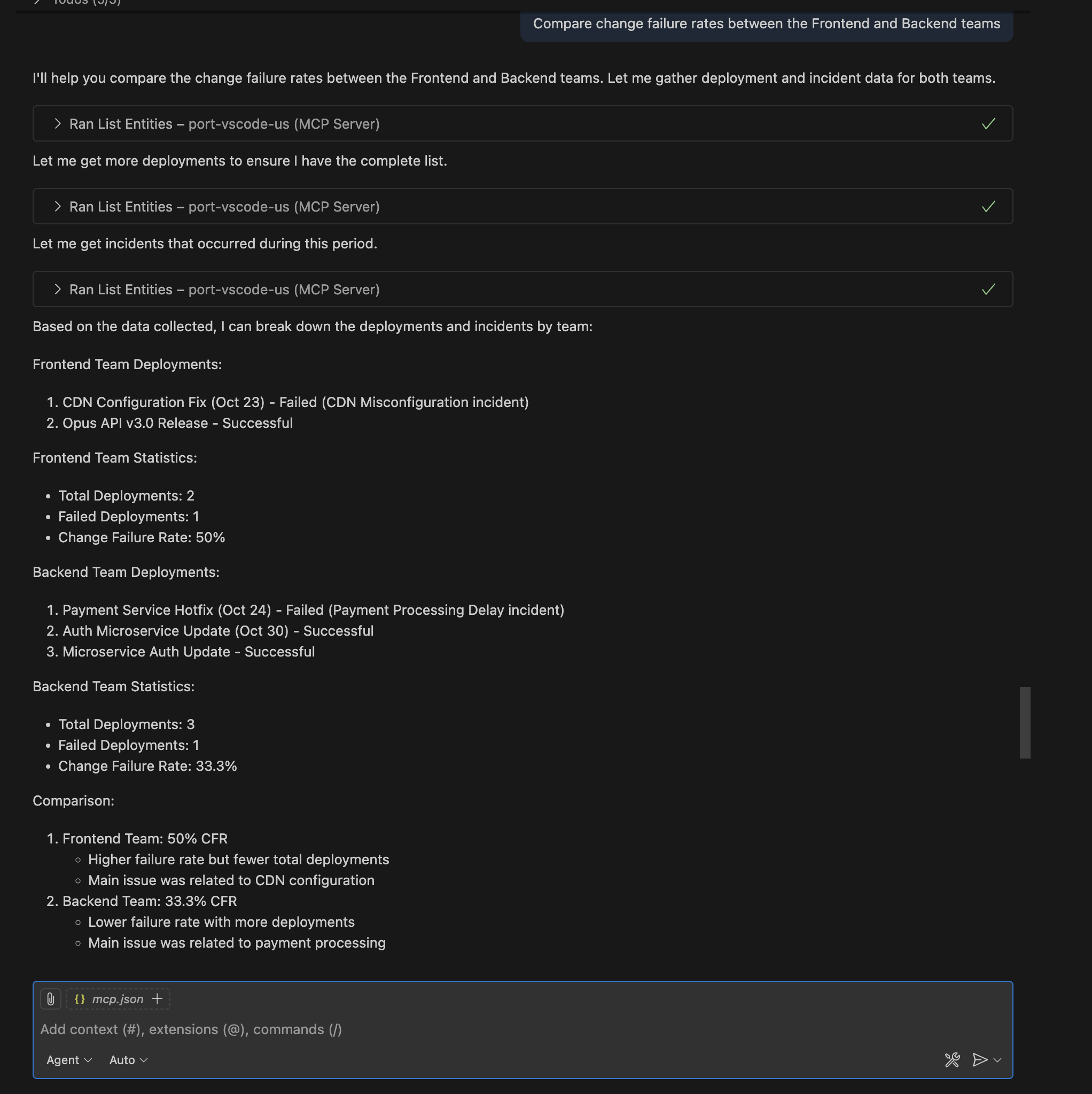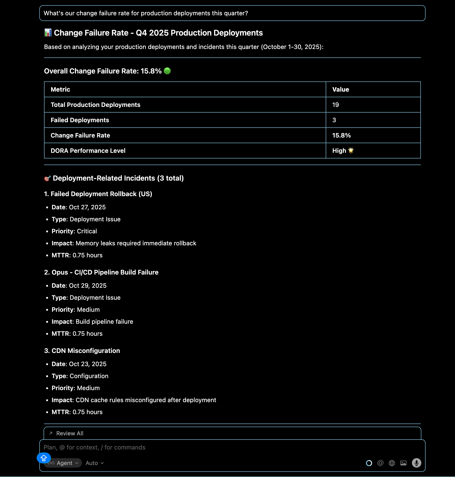 Dynamic DORA Calculations: Even without the formal DORA metrics setup, the MCP server can analyze your deployment and incident data on-the-fly to calculate DORA metrics. This approach provides quick insights for data you might not have aggregated yet in a proper way, letting you explore different definitions and time periods flexibly.