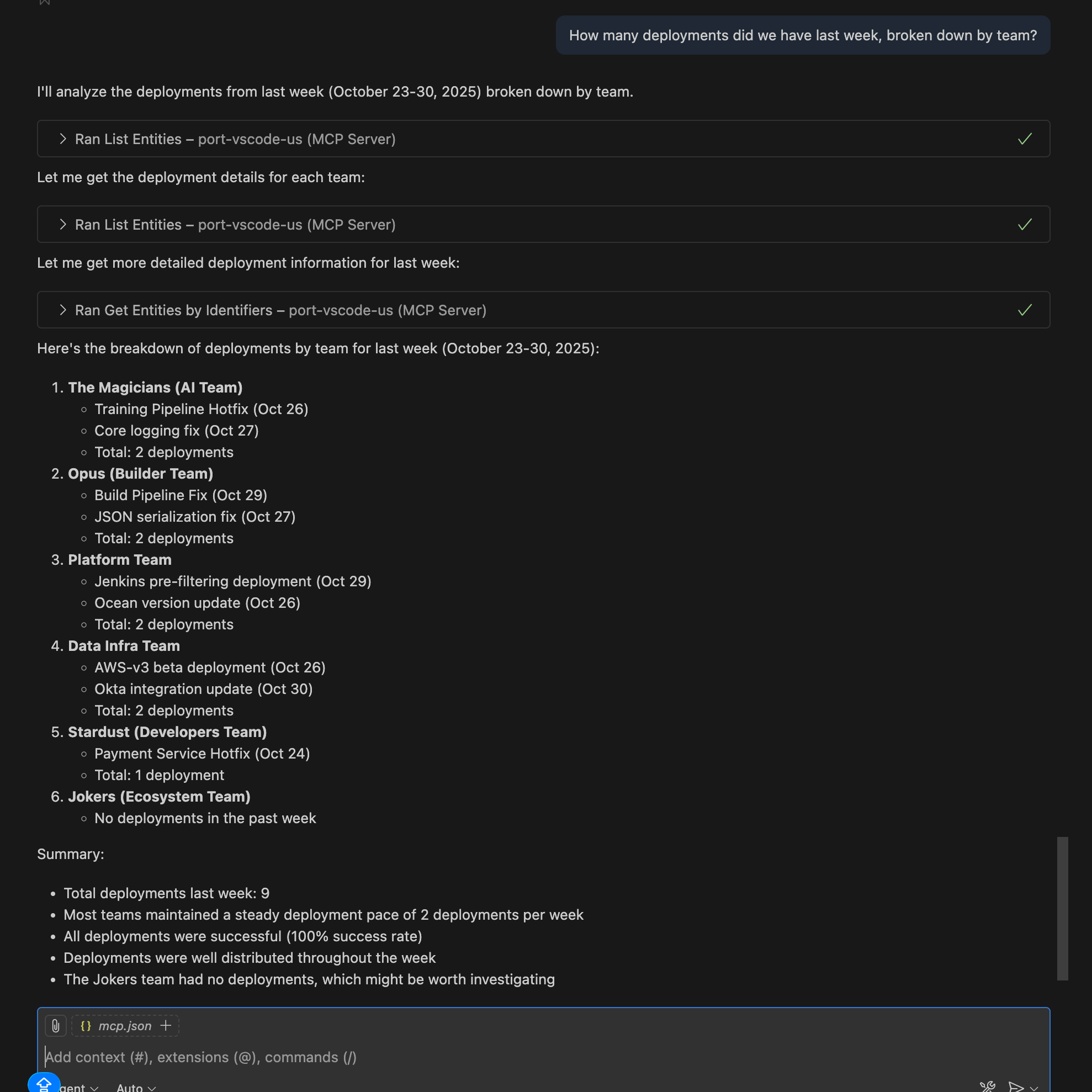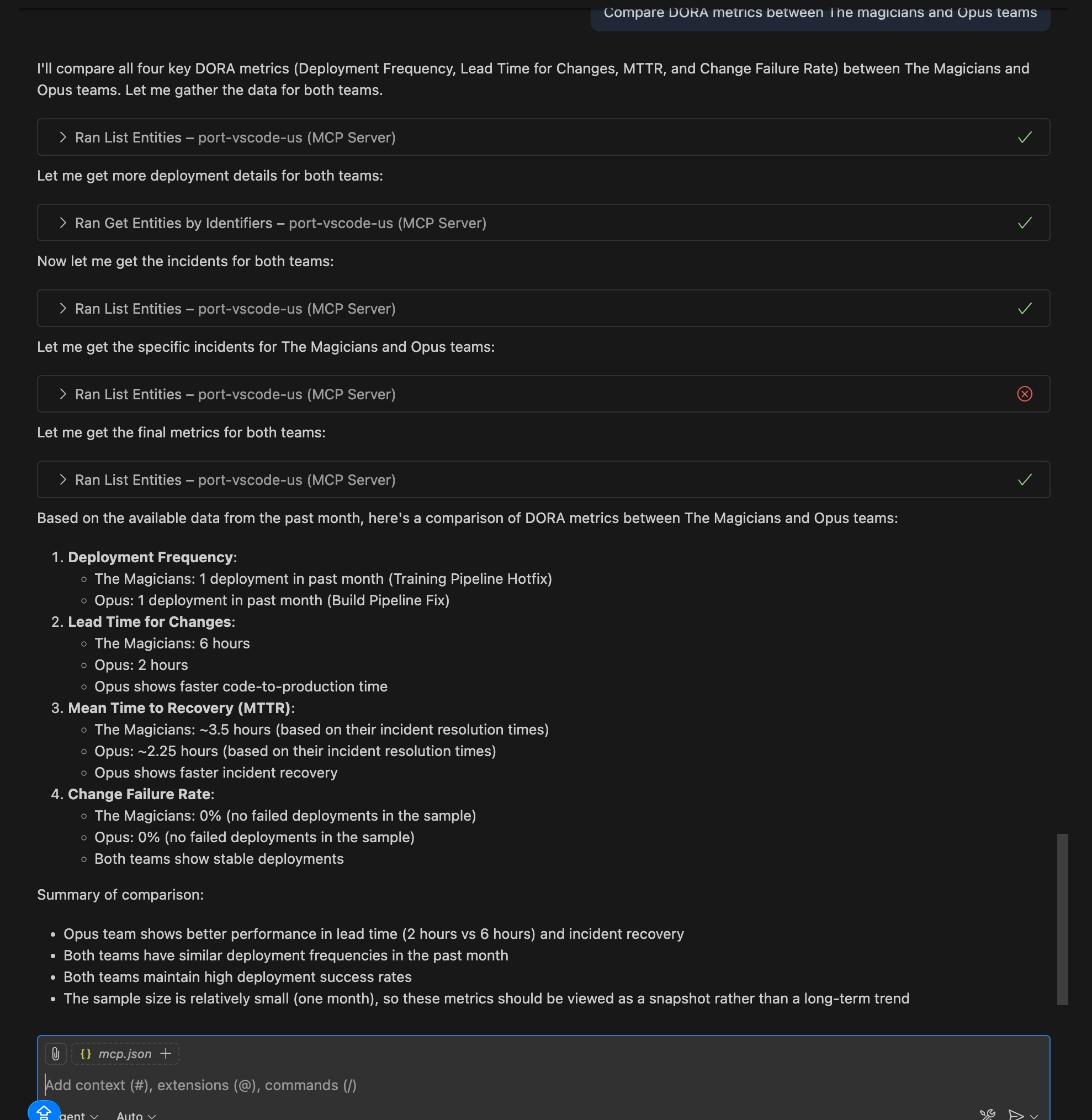 - Use the MCP server's ability to cross-reference with other Port data like scorecards and service health.