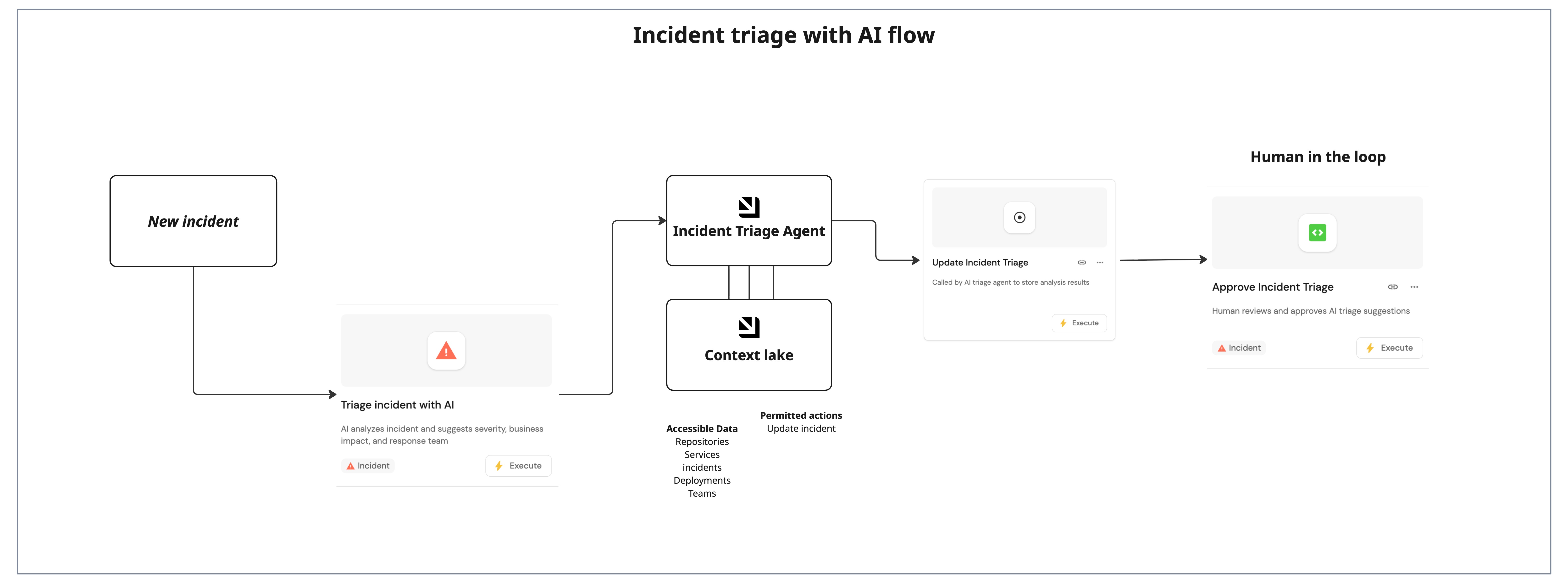The three actions implement a human-in-the-loop flow: the AI suggests severity, impact, comms, owner, and team; a human reviews and approves (or overrides) before the incident moves to investigating. This keeps triage consistent while avoiding fully automated escalation.