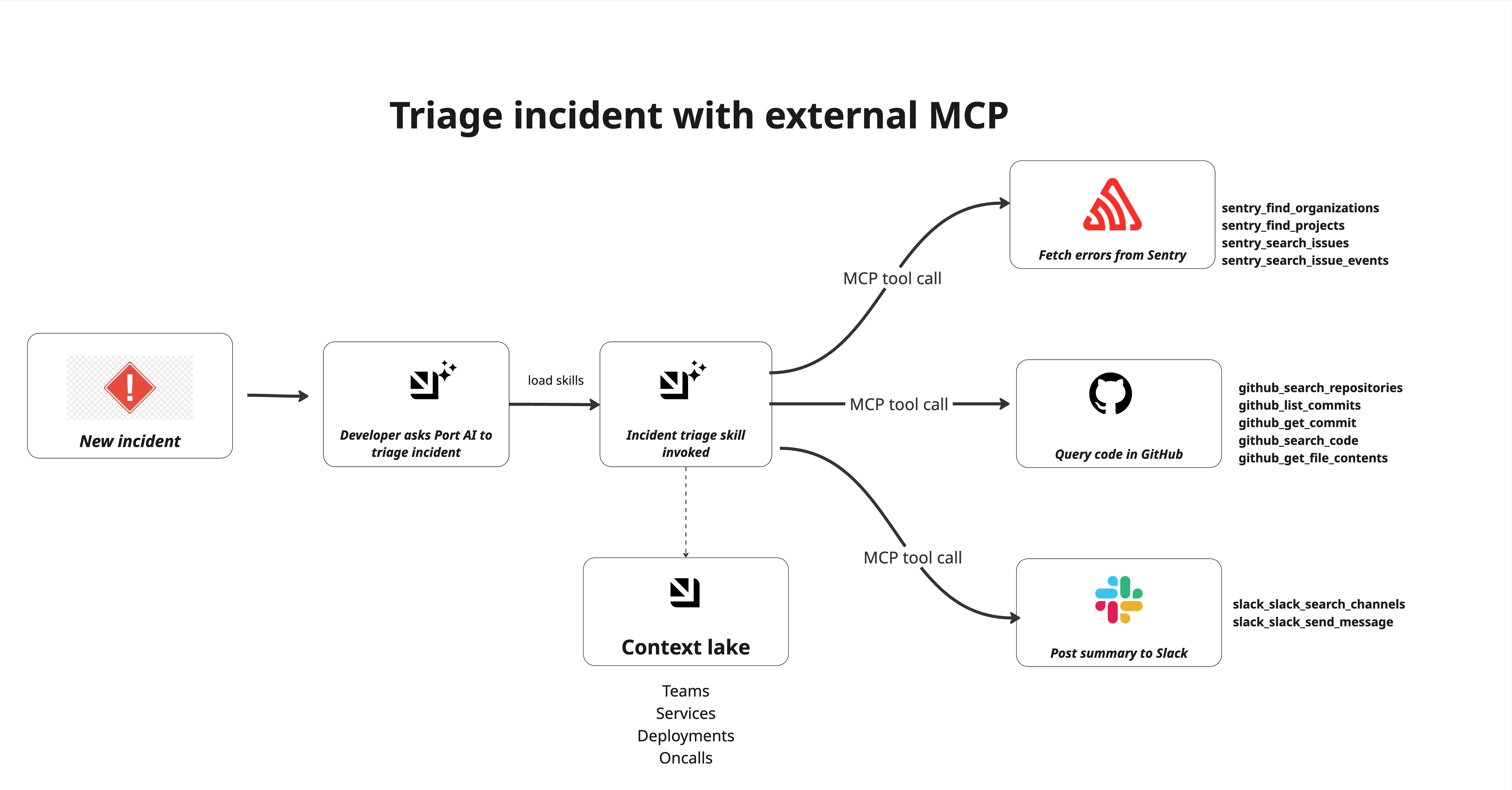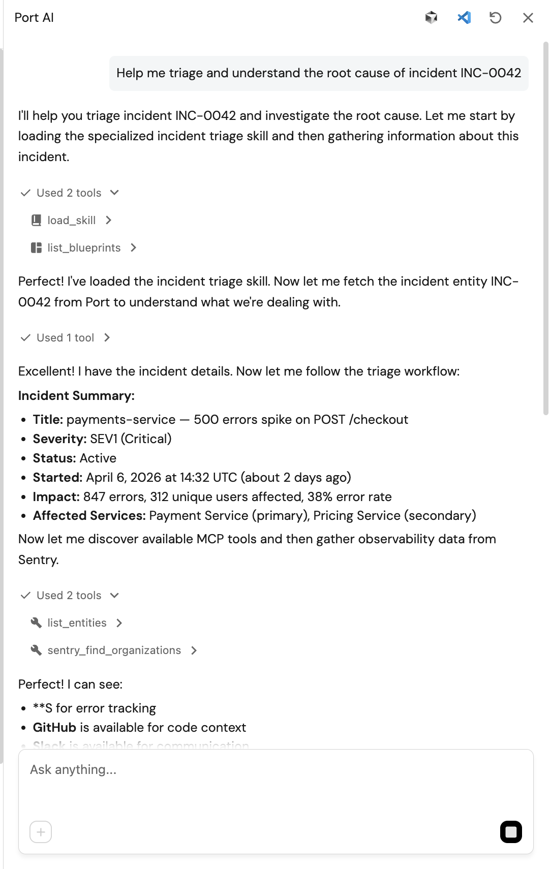 Watch Port AI automatically load the sre-incident-triage skill and call the connected MCP tools in sequence: