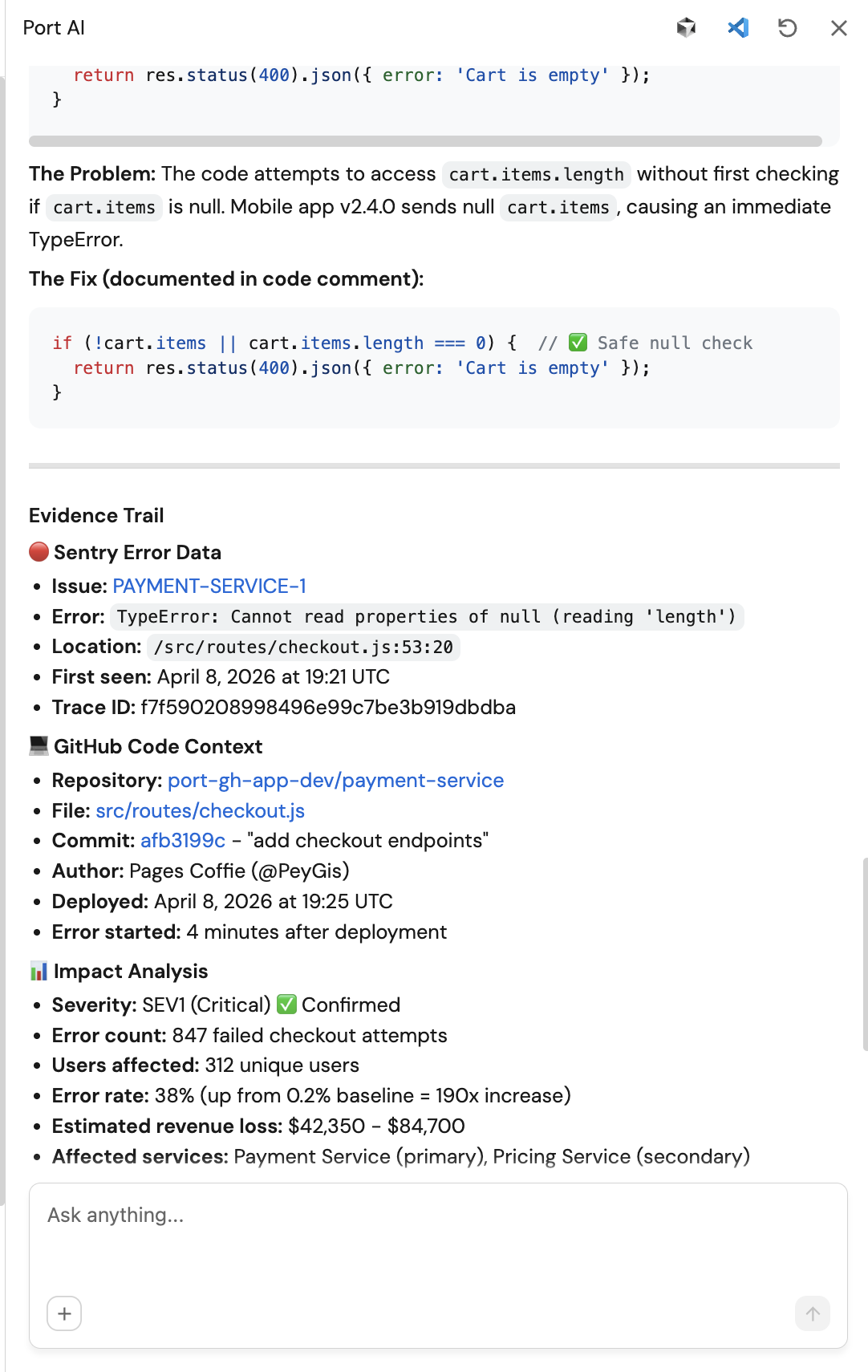 - Code-level diagnosis: Surface the exact file, function, and line number responsible for errors with the relevant code snippet without leaving Port.