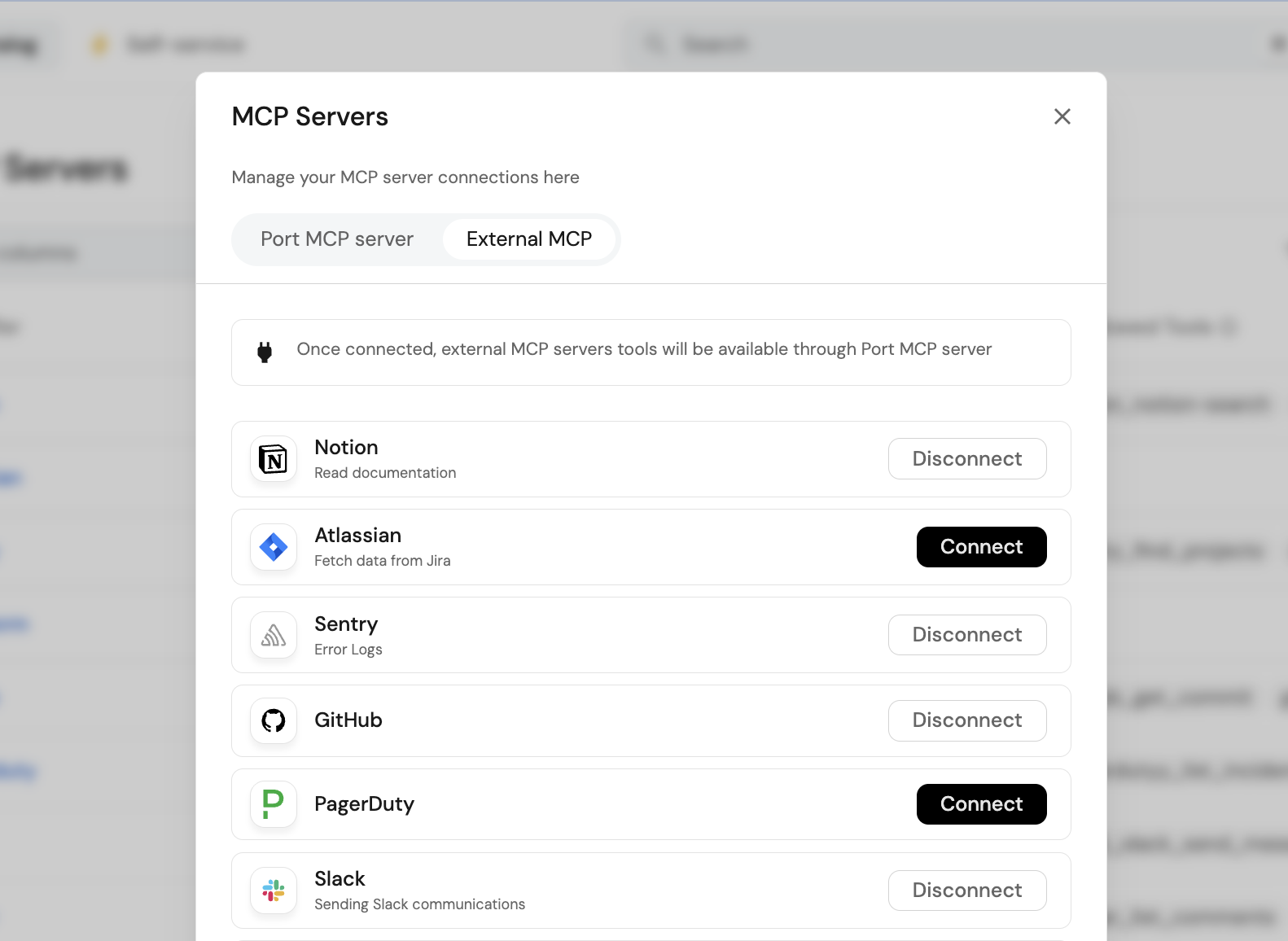 Connect MCP servers through Port's MCP connector gateway. You can learn more in MCP connectors.