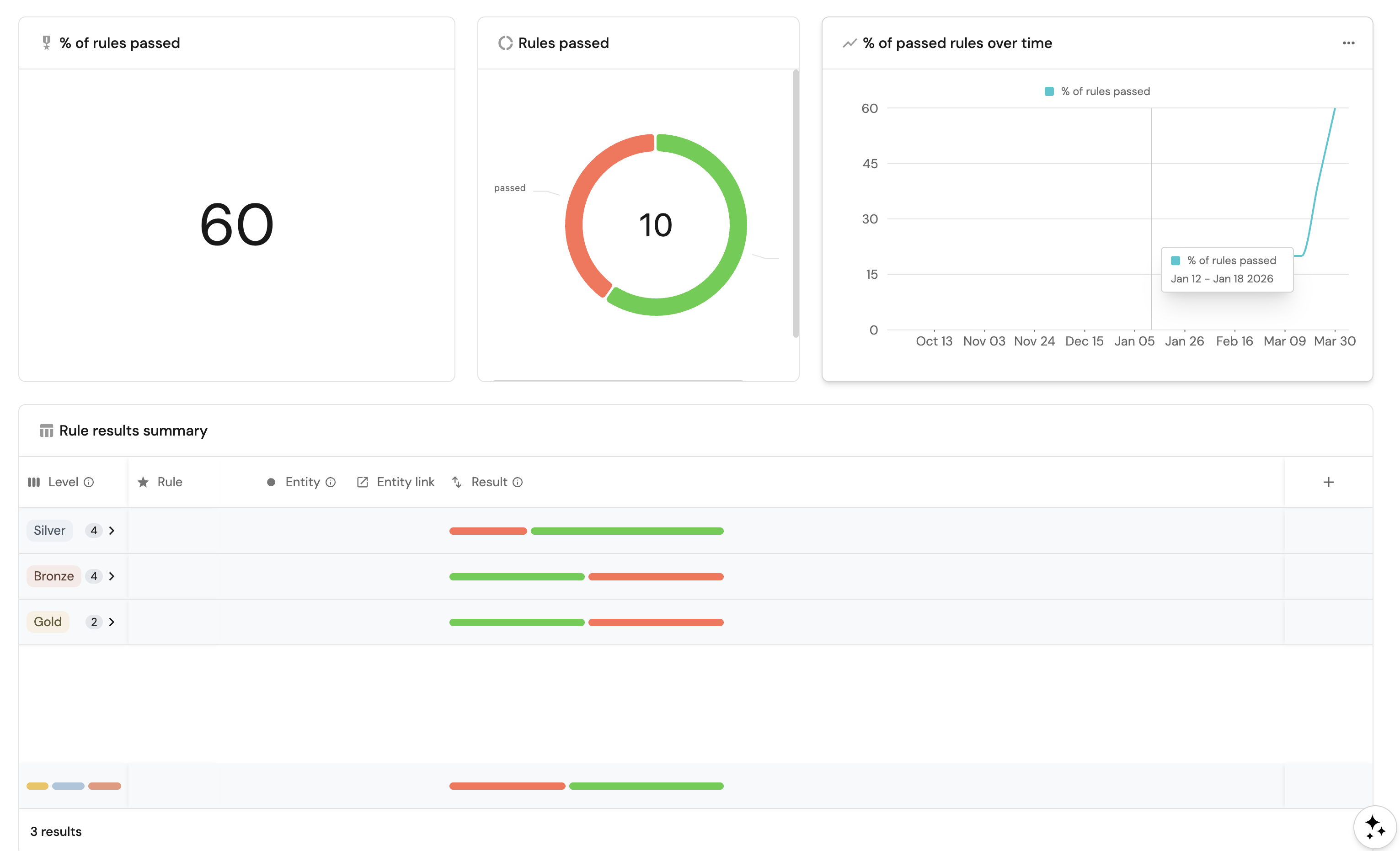Port's pipeline reliability scorecards evaluate every service and team against CI/CD health metrics using Bronze, Silver, and Gold maturity levels. Pipeline data flows in from GitHub Actions, GitLab CI, Azure Pipelines, and other CI/CD tools, linked to services and teams in your software catalog & context lake. Teams see at a glance whether their pipelines meet reliability thresholds and which specific rules are pulling their score down. When a service drops below a tier, workflows can notify the owning team or create a remediation ticket automatically.